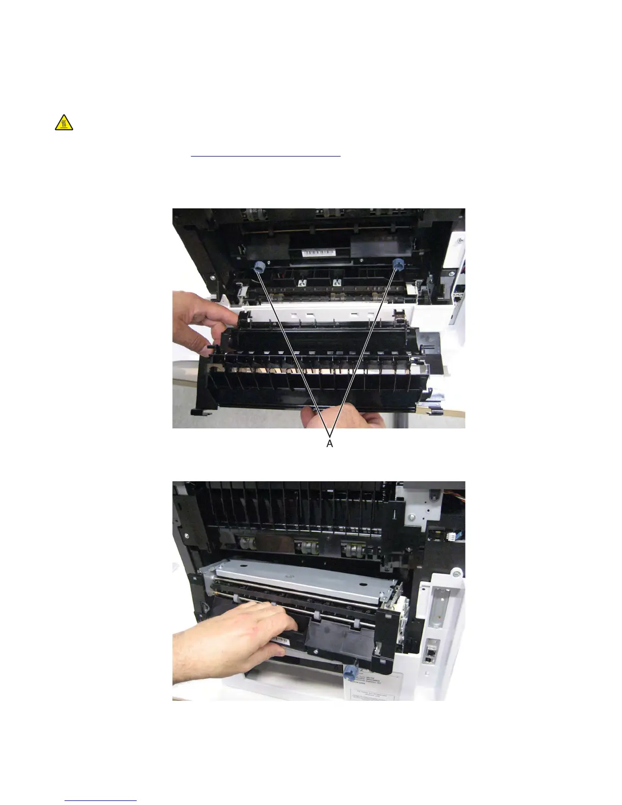 CAUTION—HOT SURFACE: The inside of the printer might be hot. To reduce the risk of injury from a hot