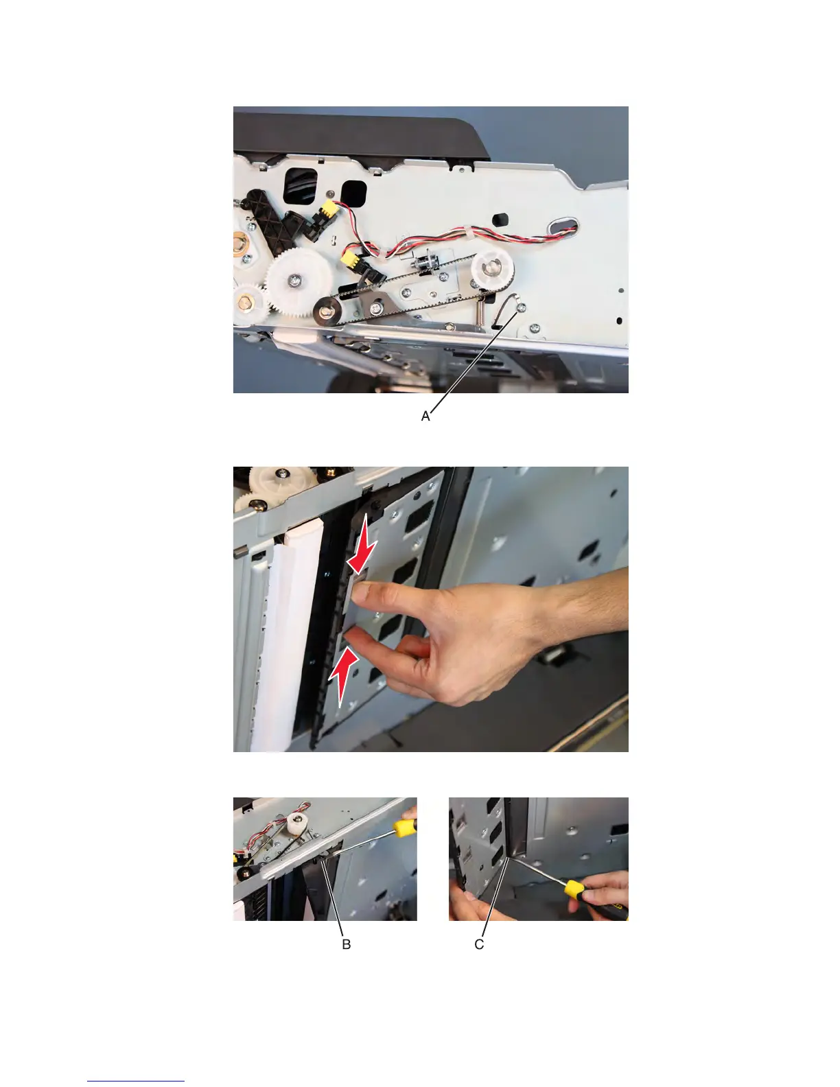7 Pry the hinge on the front (B) and rear (C) of the ADF bottom door to release the tabs.