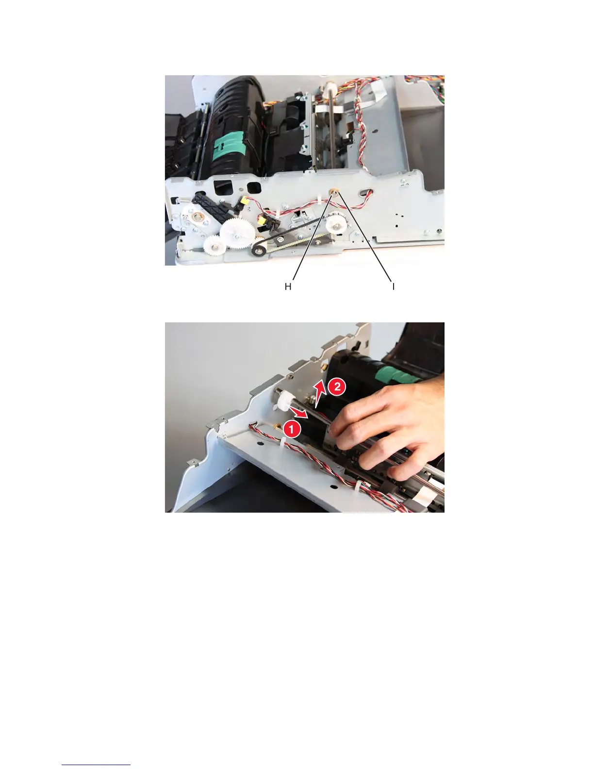9 Remove the c-clip (H) and bushing (I) from the front of the ADF tray lift drive.