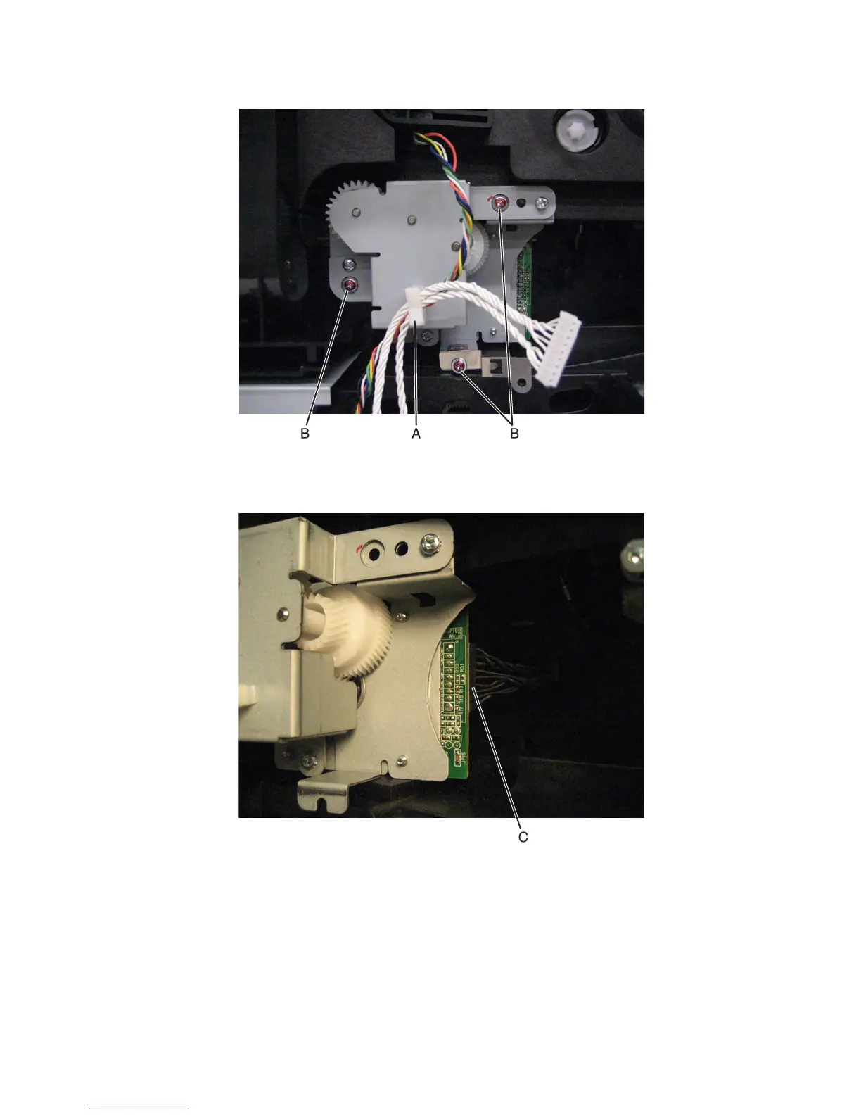 9 Remove the three screws (B) securing the fuser drive motor to the machine.