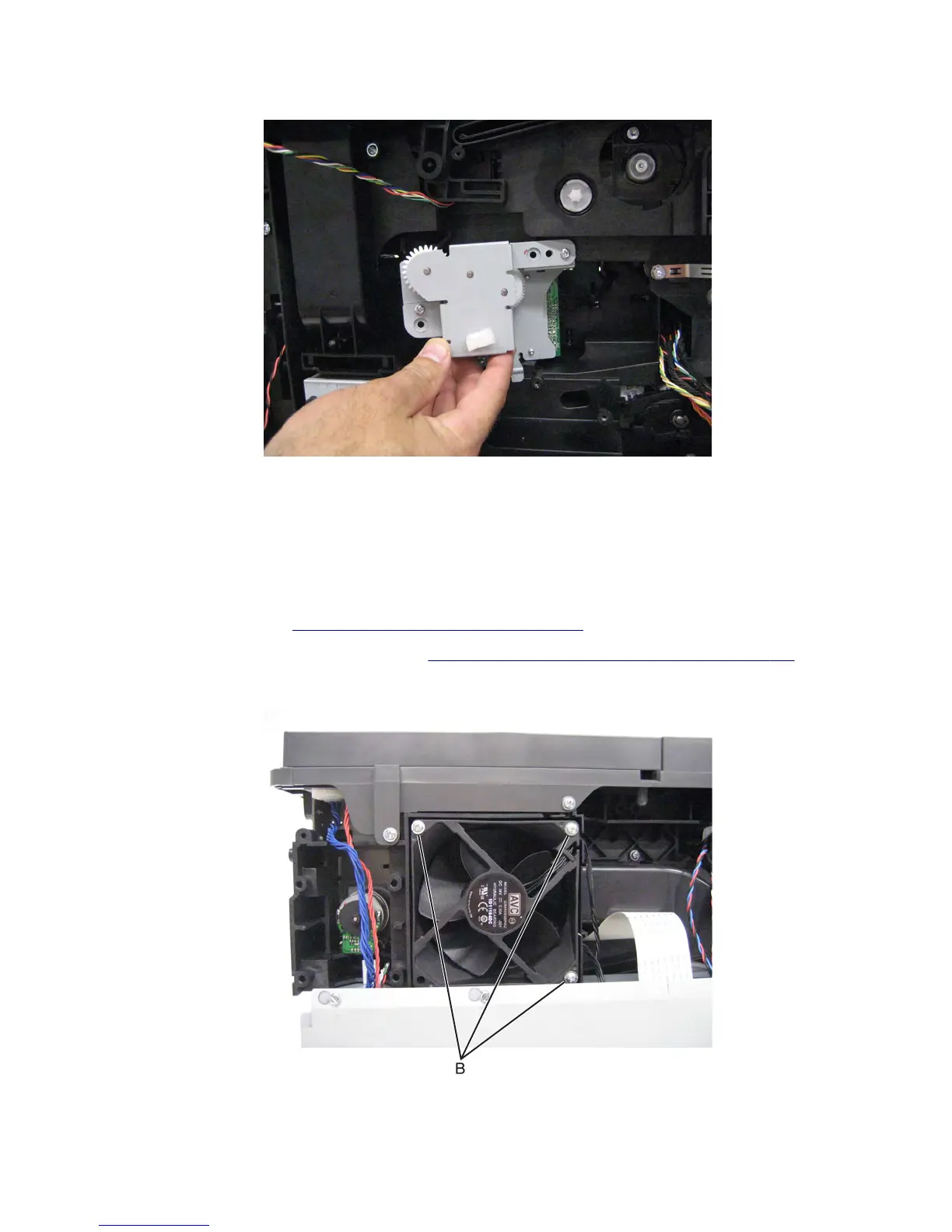 3 Remove the three screws (B) securing the main cooling fan to the machine.