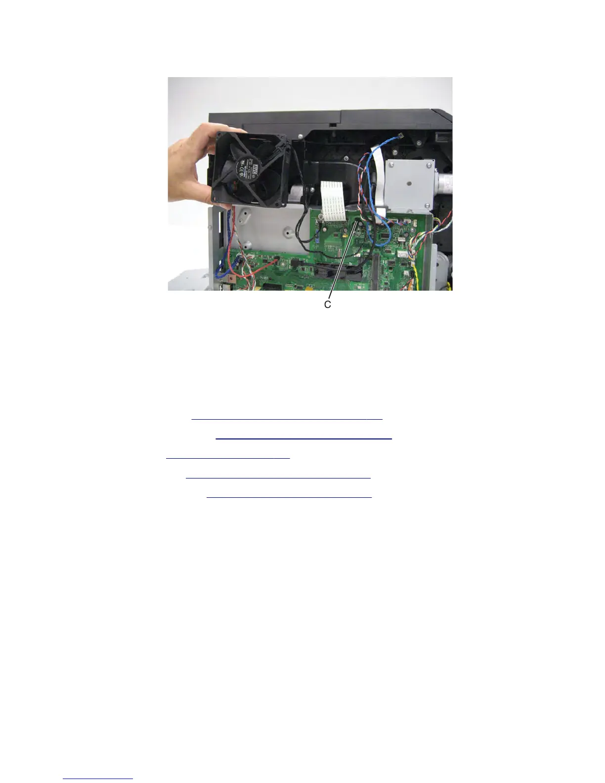 4 Disconnect the cable (C) from the controller board, and remove the main cooling fan.
