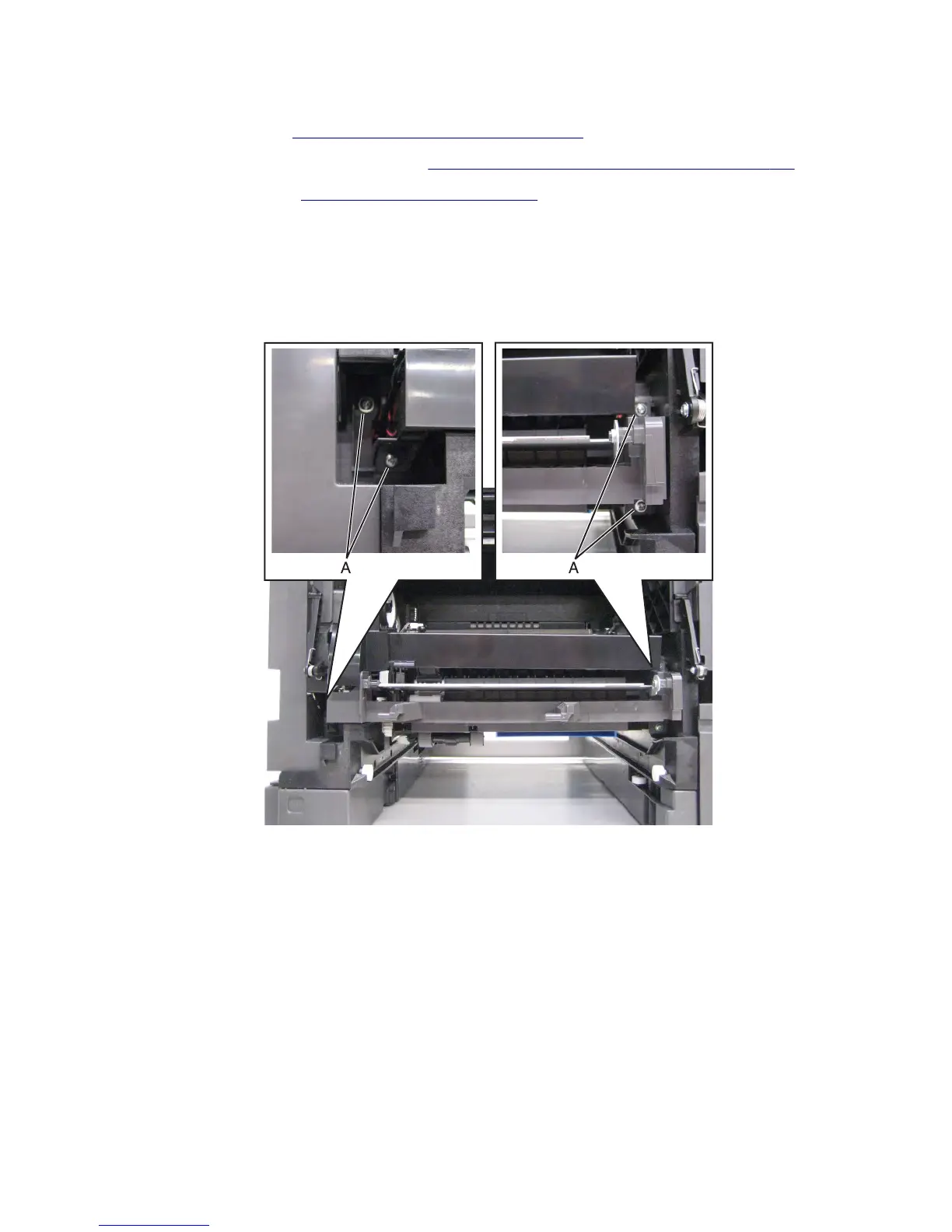 7 Remove the four screws (A) securing the MPF feeder lift plate to the machine.