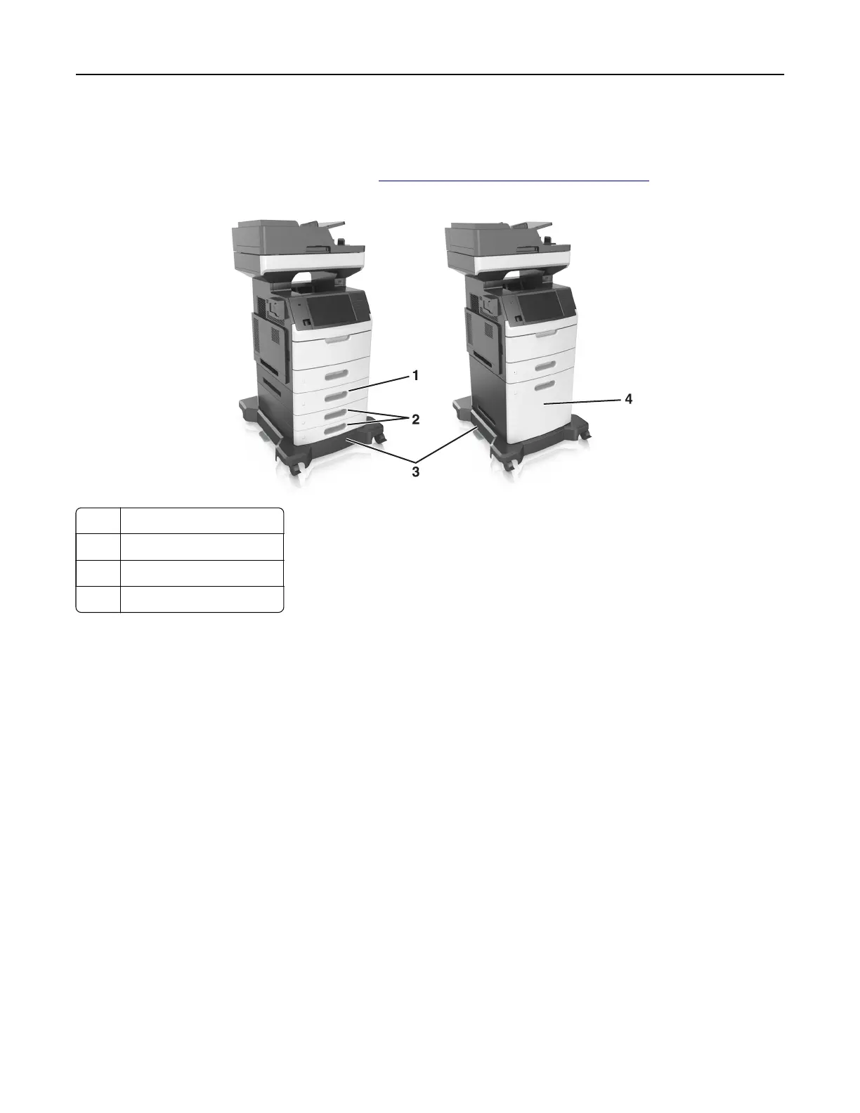 The following illustration shows the maximum number of optional trays that are supported by the printer. For