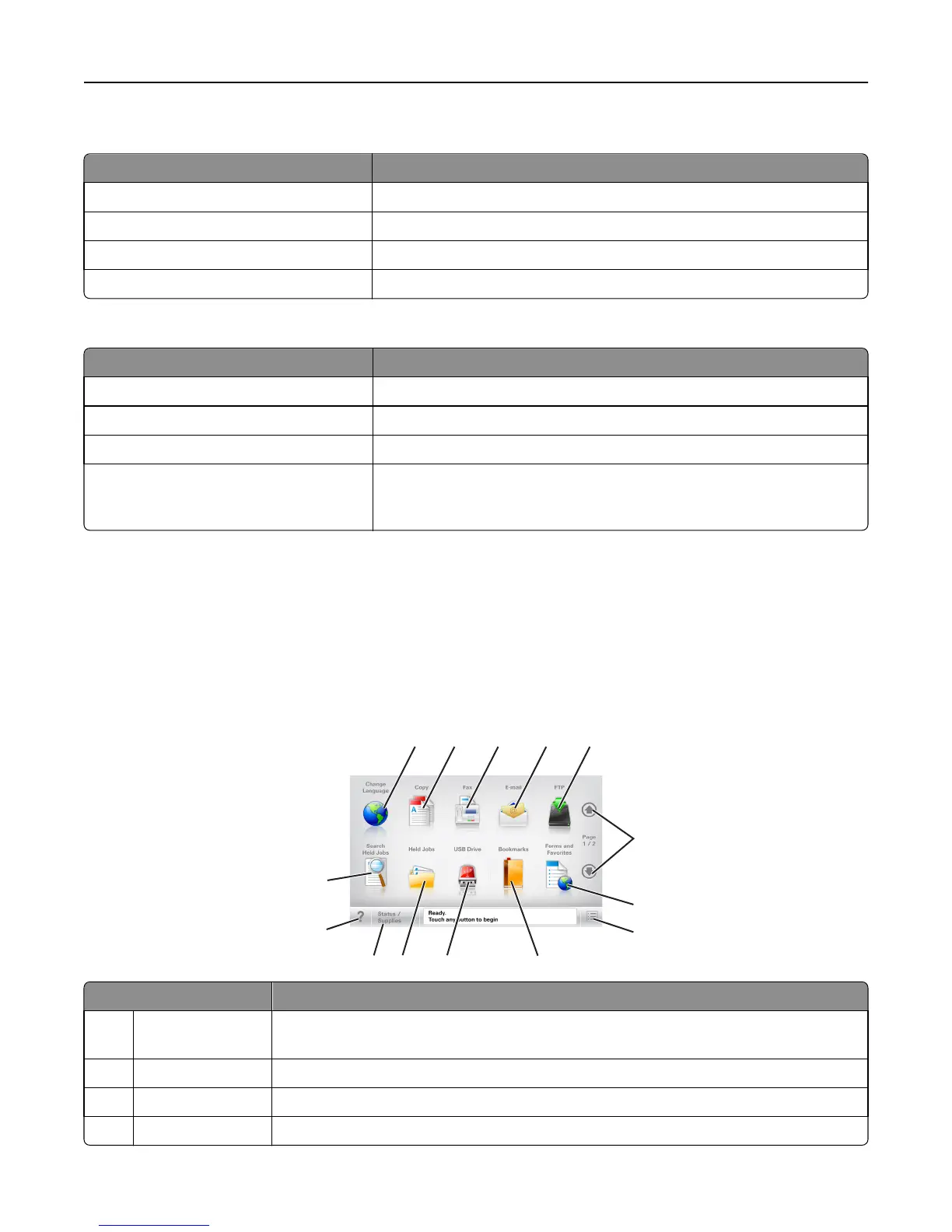 When the printer is turned on, the display shows a basic screen, referred to as the home screen. Touch the home screen