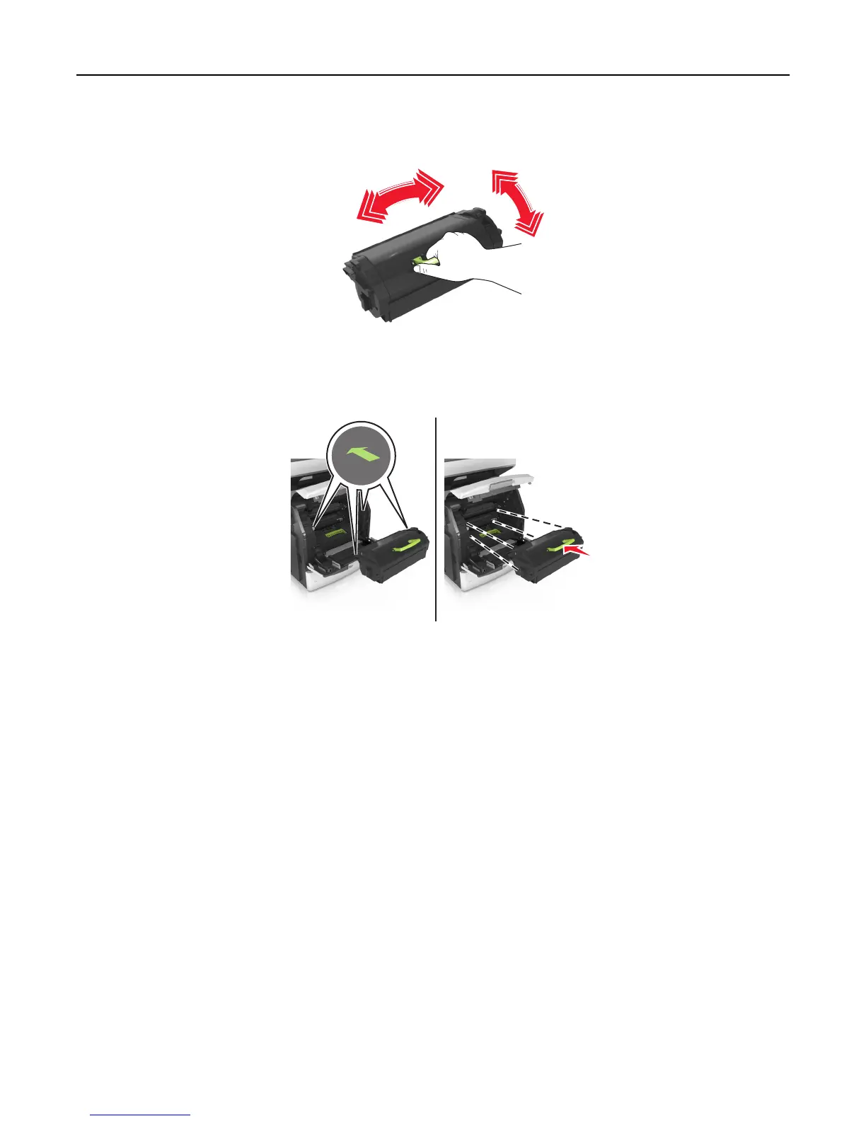 4 Insert the toner cartridge into the printer by aligning the side rails of the cartridge with the arrows on the side rails