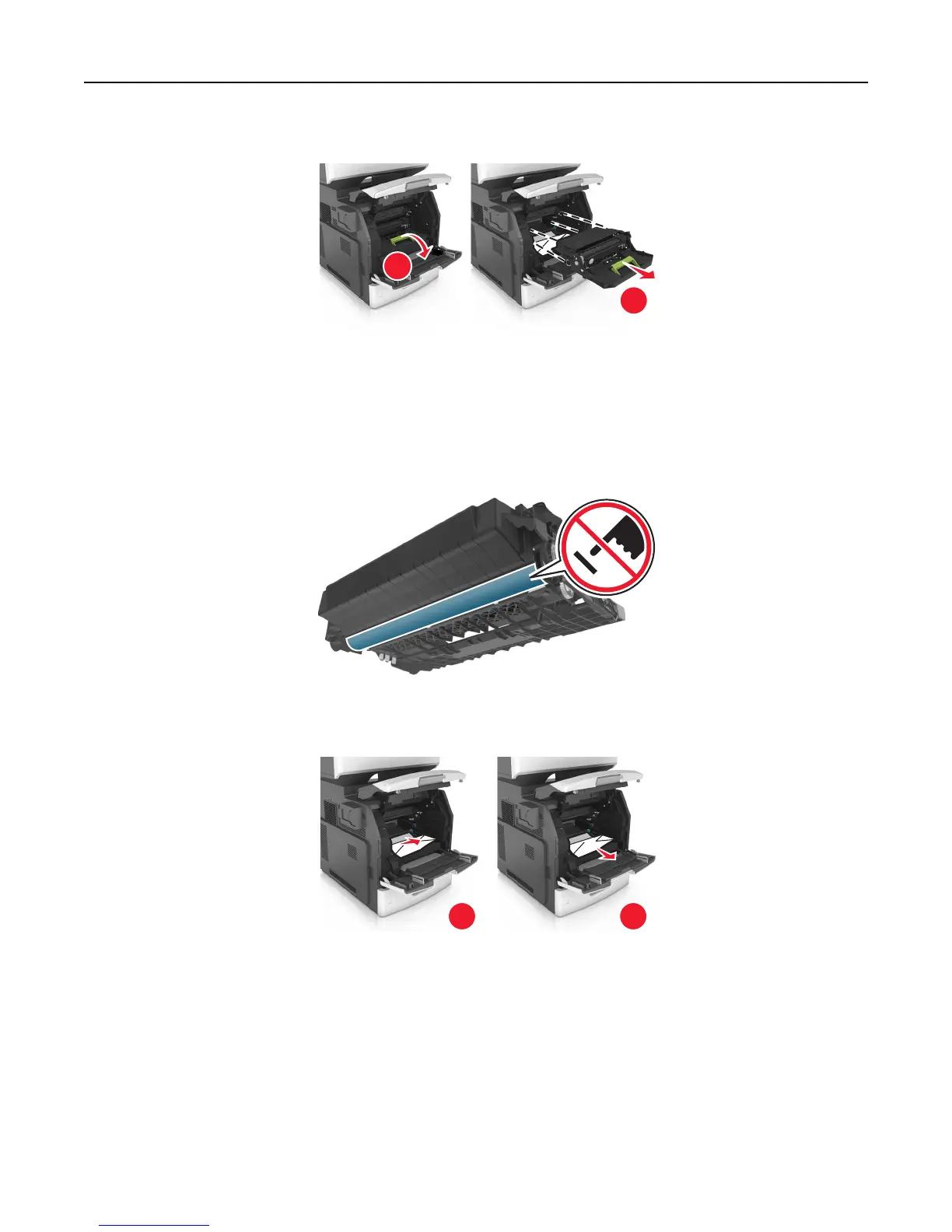 Warning—Potential Damage: Do not touch the photoconductor drum. Doing so may affect the print quality of
