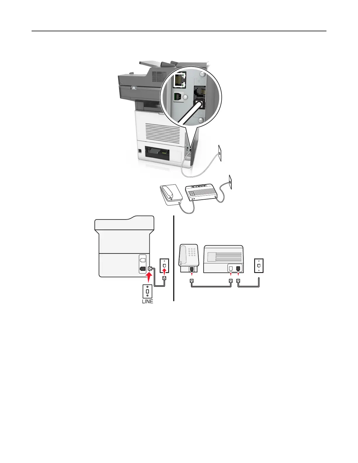 1 Connect one end of the telephone cable to the line port of the printer.