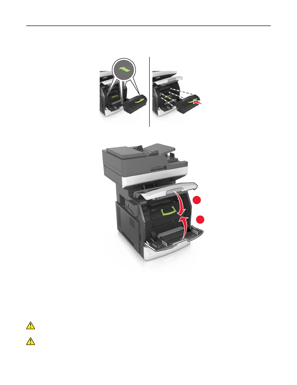 7 Insert the toner cartridge into the printer by aligning the side rails of the cartridge with the arrows on the
