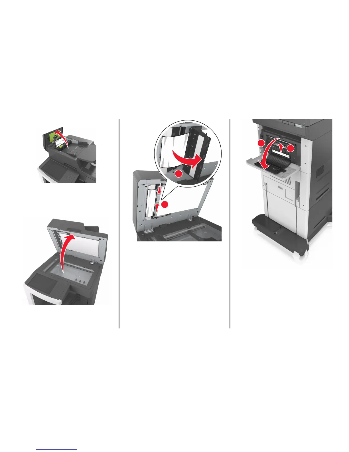 [x]‑page jam, remove paper, open finisher