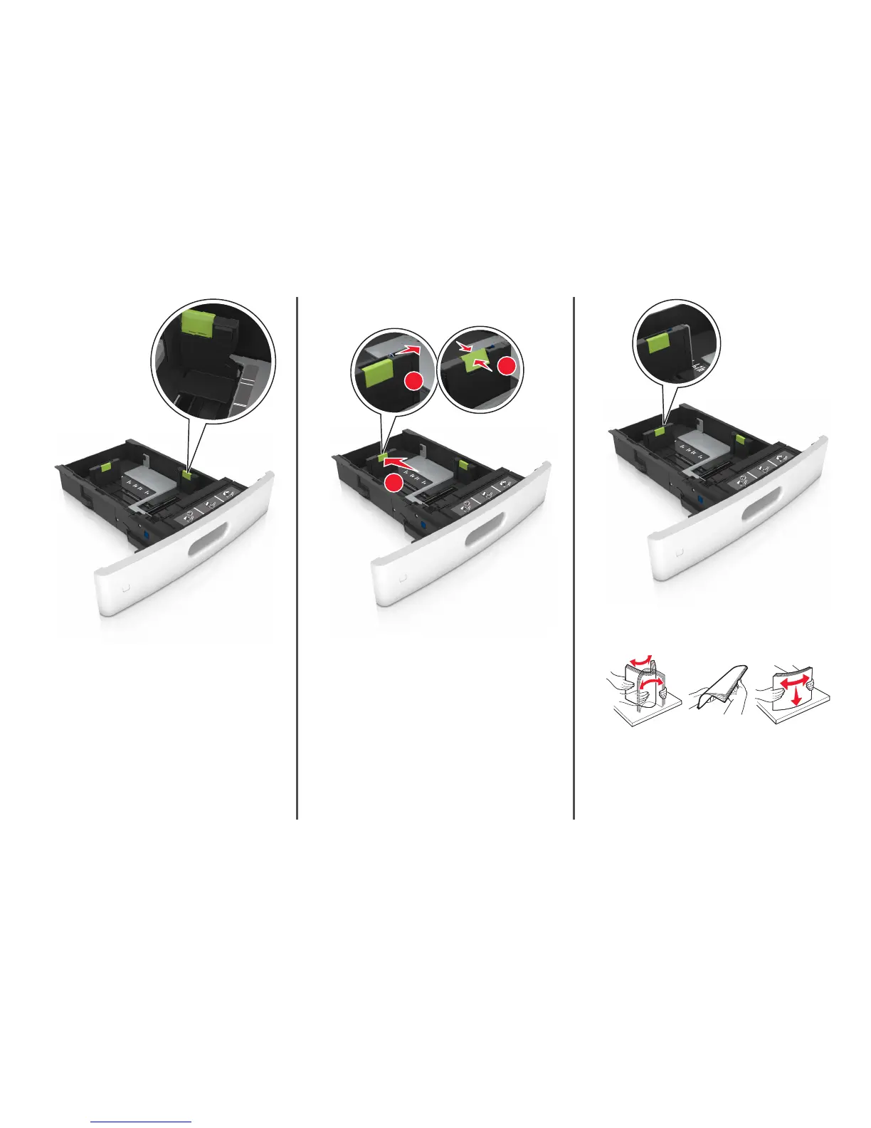 • Use the paper size indicators on the bottom of the tray to