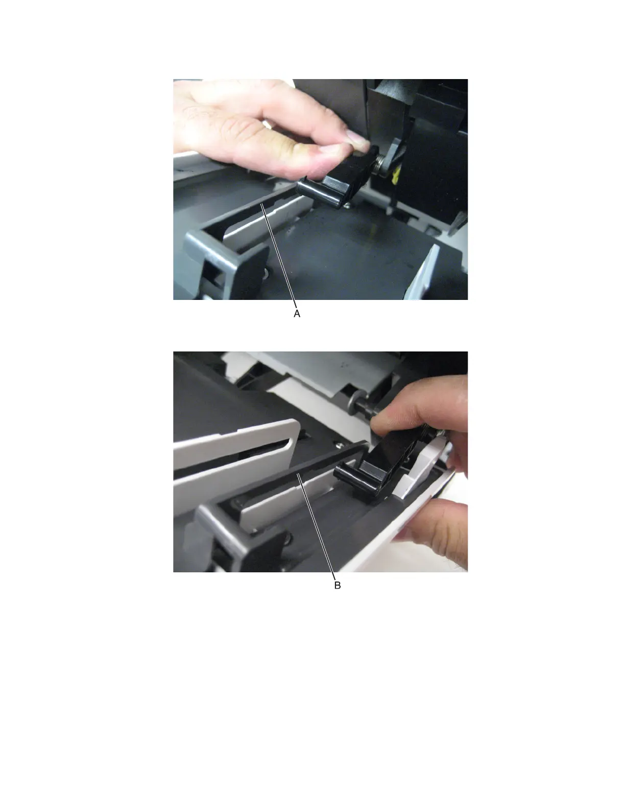 5 Gently flex the right bracket (B) and release the tab on the MPF support link.