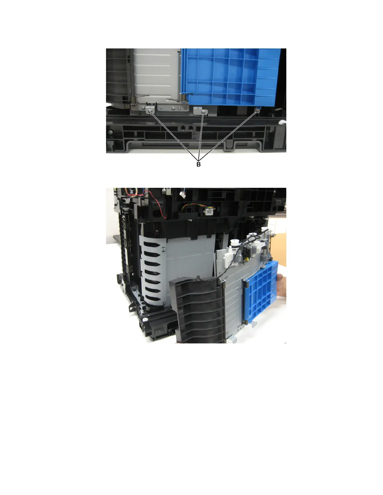 13 Remove the three screws (B) securing the duplex to the machine.