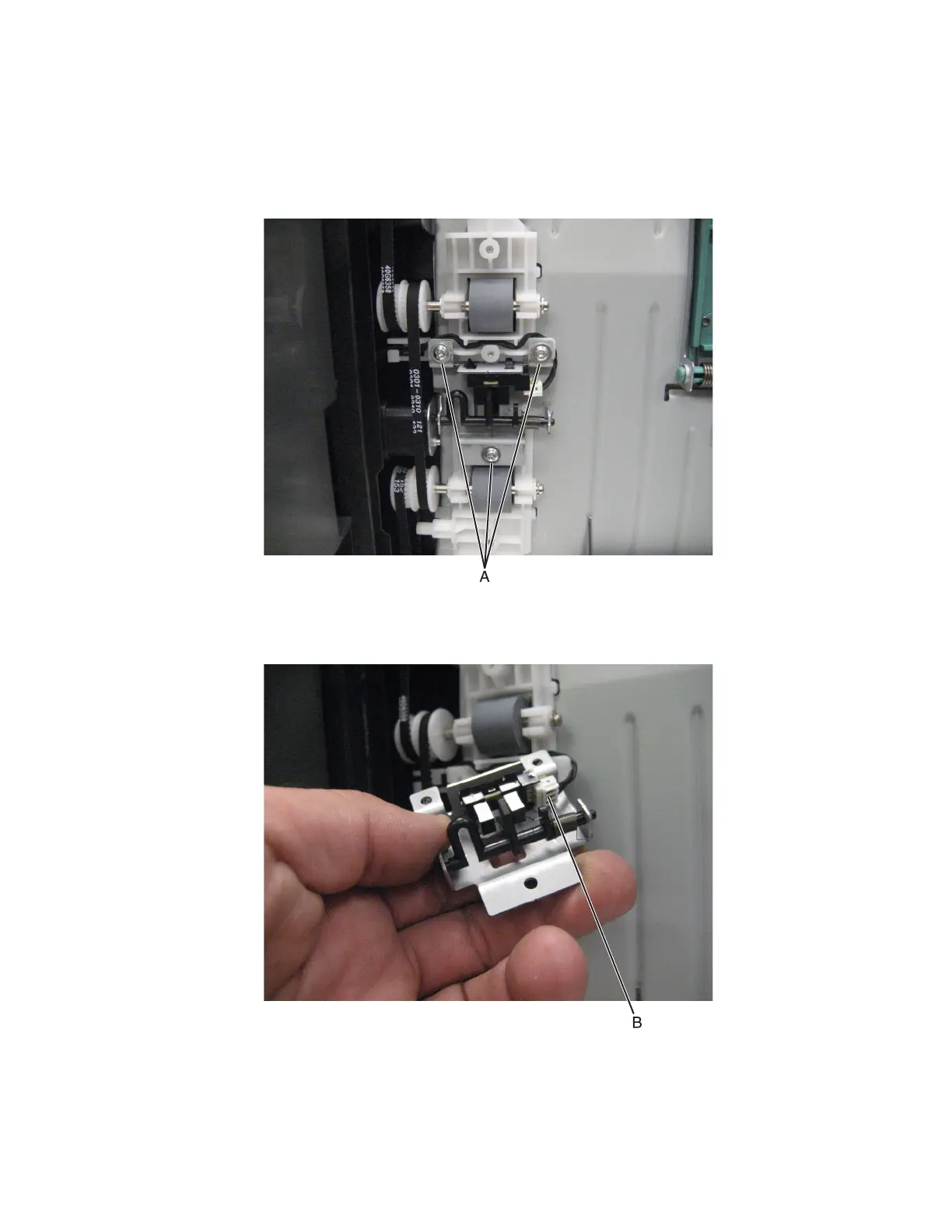 5 Disconnect the cable (B) from the sensor (duplex path).