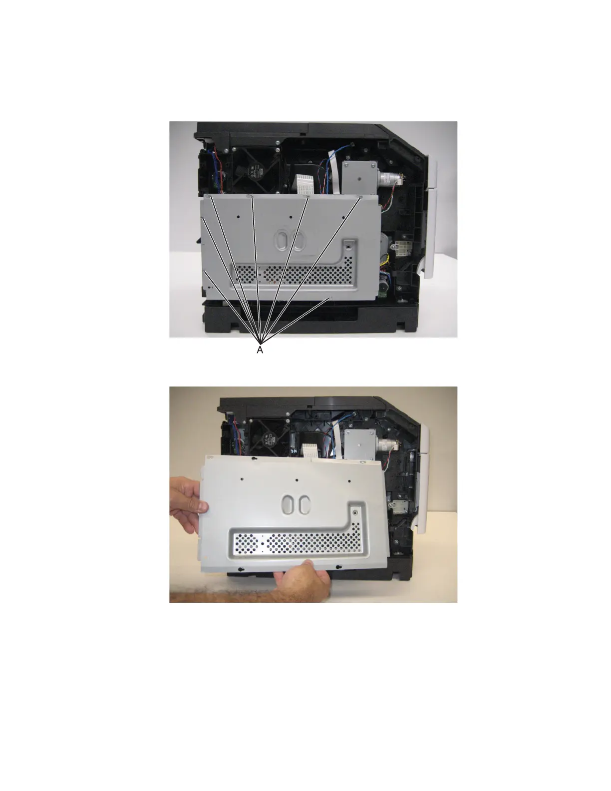 2 Loosen the eight screws (A) securing the controller board access shield to the machine.
