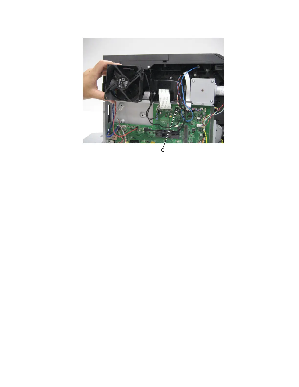4 Disconnect the cable (C) from the controller board, and remove the main cooling fan.