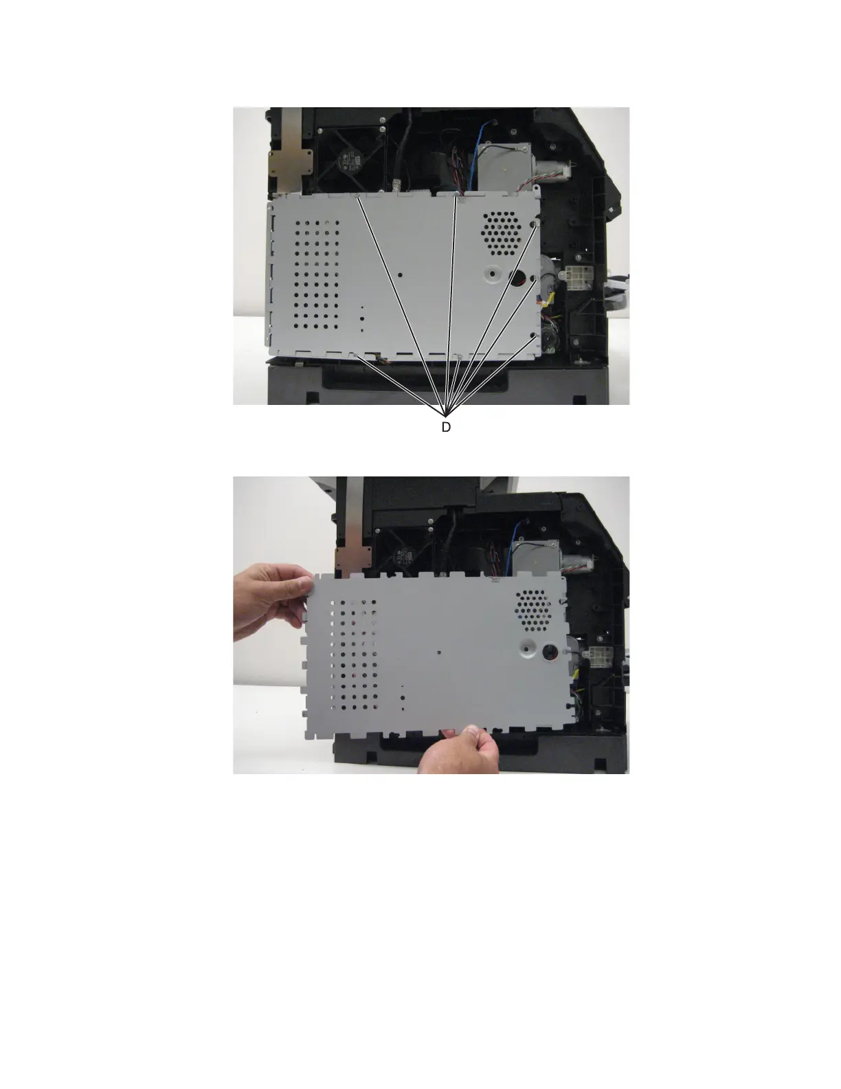 7 Loosen the six screws (D) securing the controller board shield to the machine.
