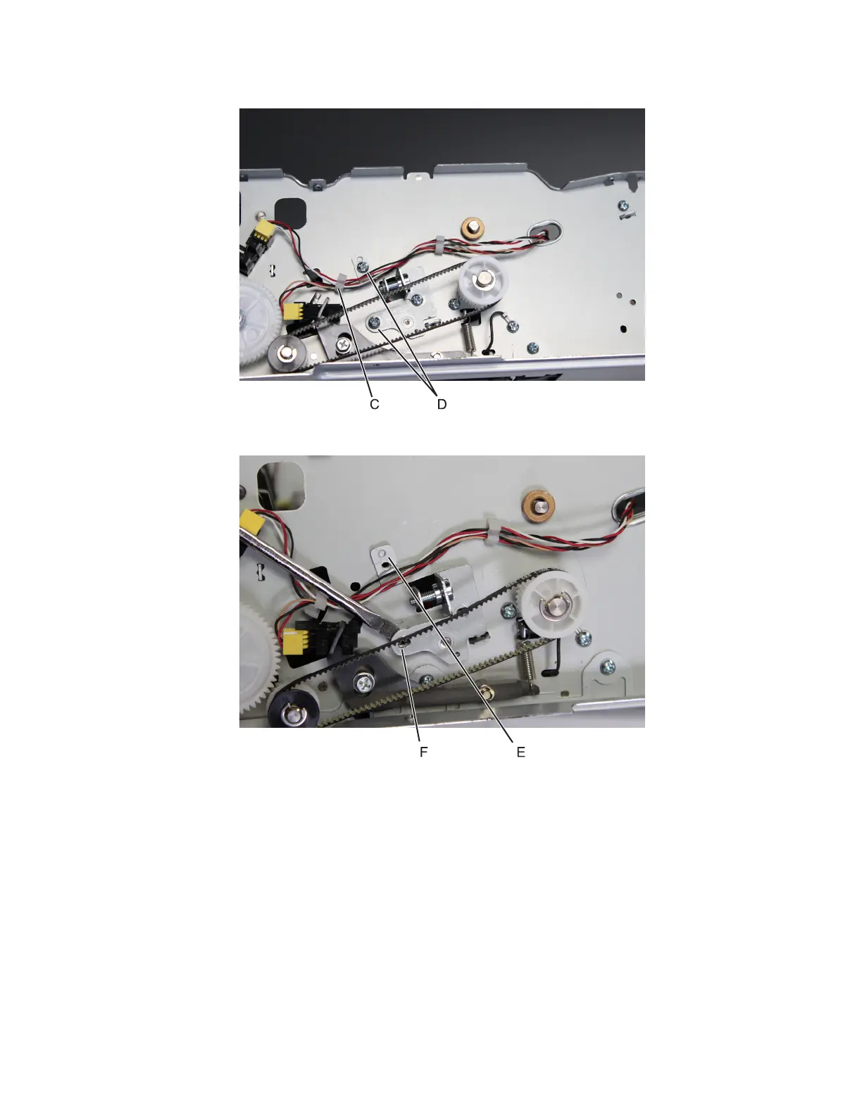 8 Remove the cable holder (C) and the three screws (D) securing the support brackets on the front of the ADF.