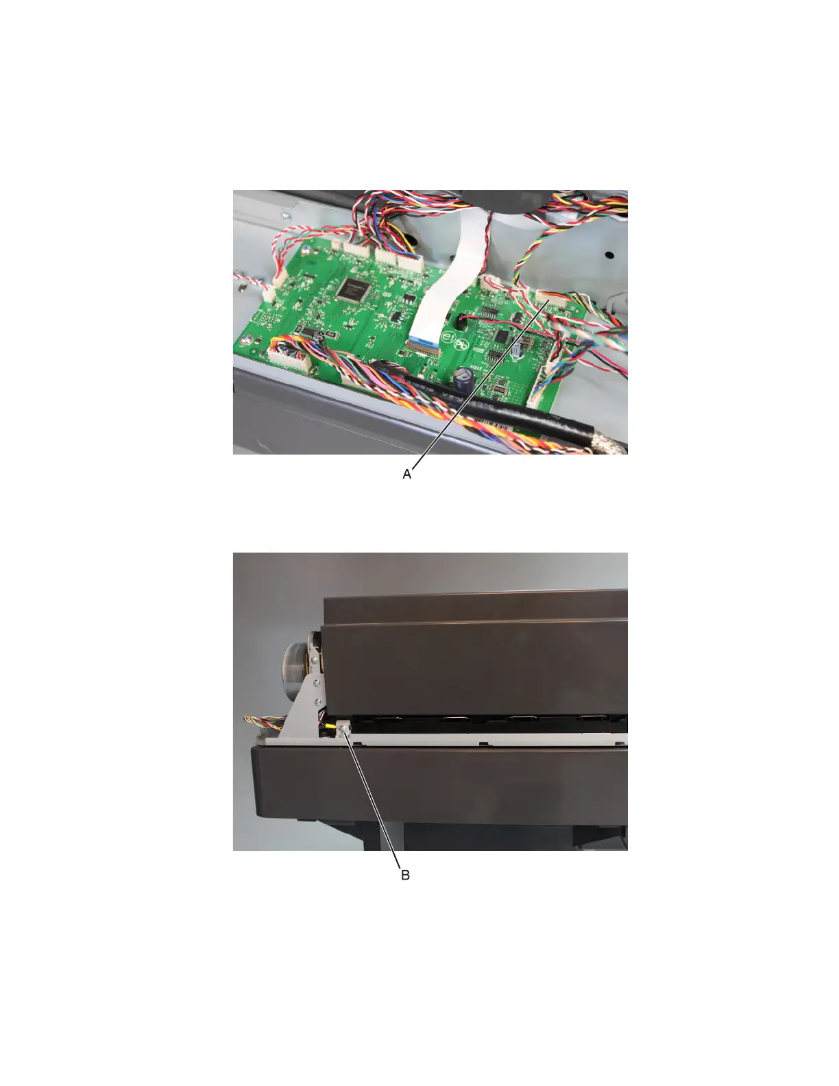 3 Disconnect the JHINGE1 cable (A) from the ADF controller.
