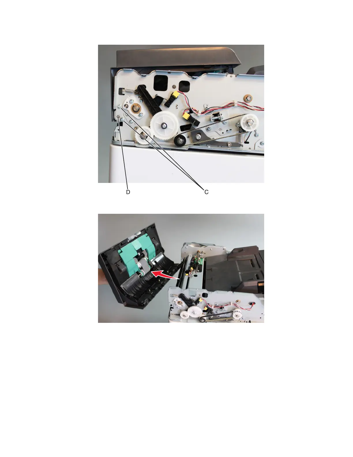 6 Remove the two screws (C) and the retaining bracket (D) securing the ADF door.
