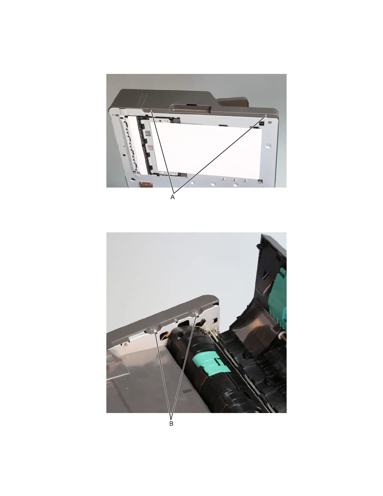 4 Remove the two screws (B) on the top side of the ADF front cover.