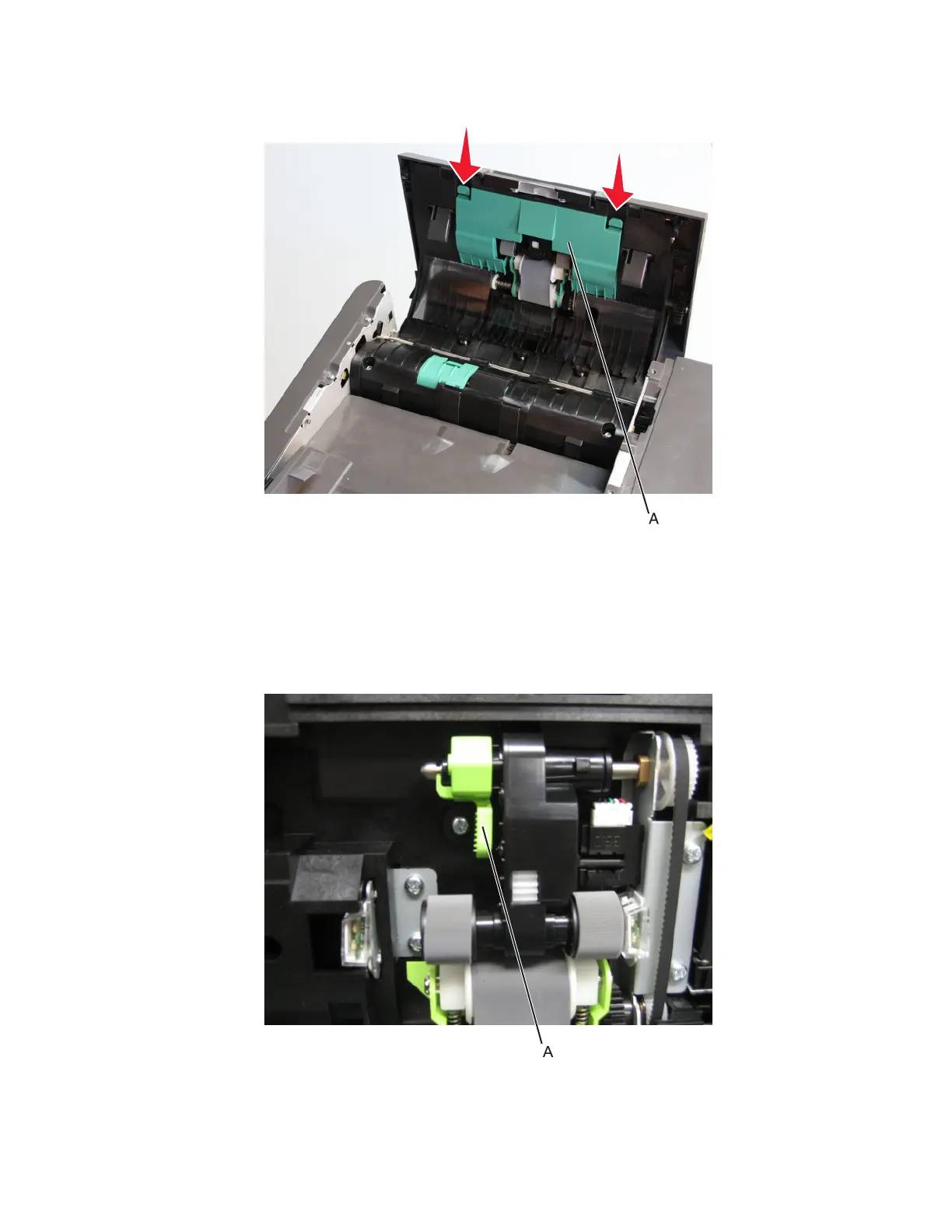2 Press the two latches on the ADF pick roller cover, and then remove the ADF pick roller cover (A).
