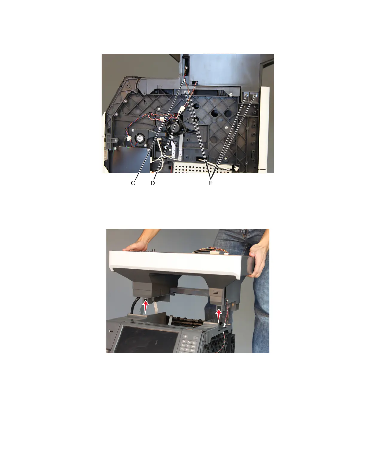 7 Disconnect the speaker cable (C) and bin LED cable (D), and then remove the four screws (E) securing the flatbed