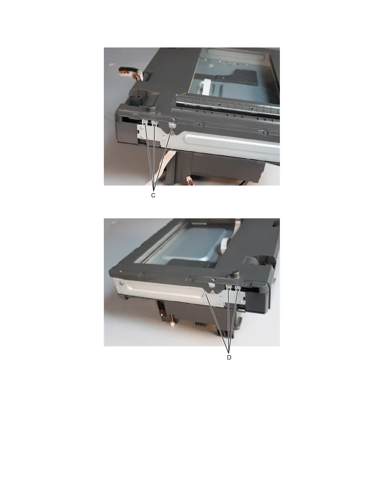 9 Remove the three screws (D) at the right side.