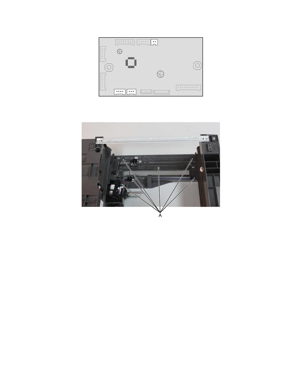 5 Remove the six screws (A) under the drawer.