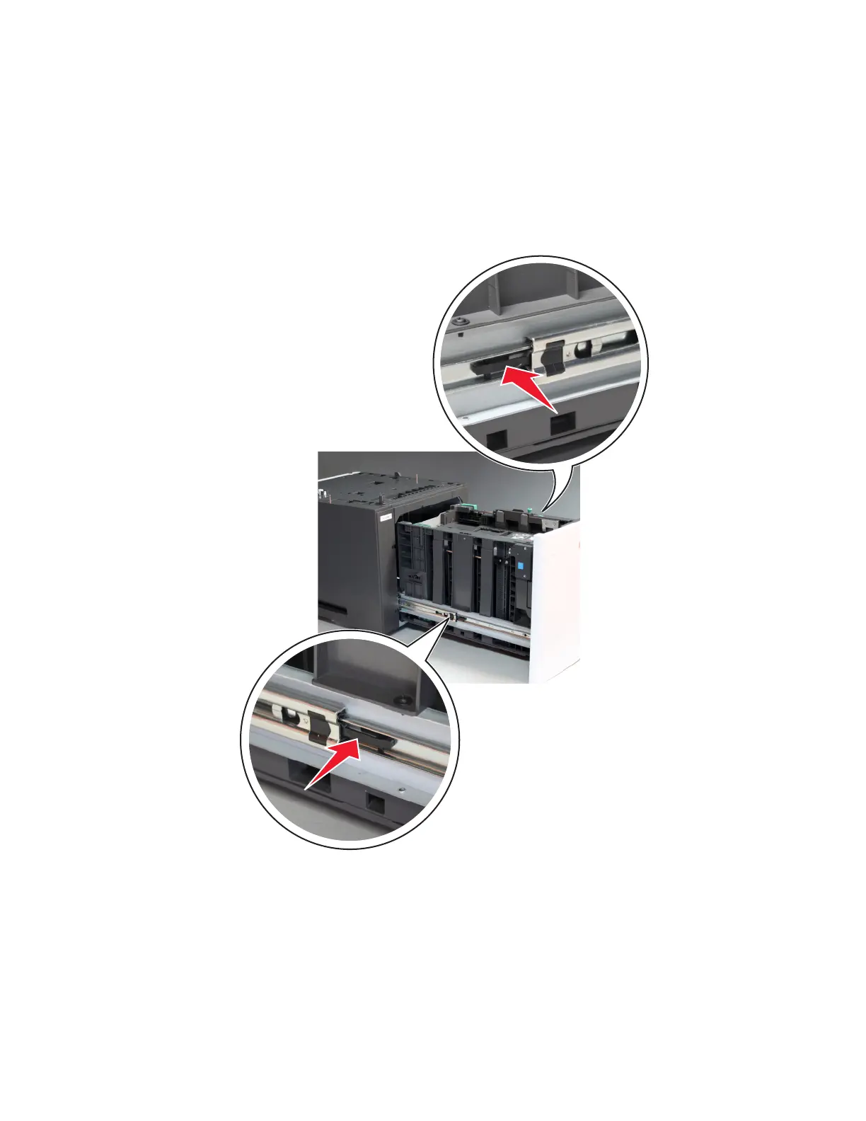 1 Fully extend the tray, then press the left and right latches to release the tray.