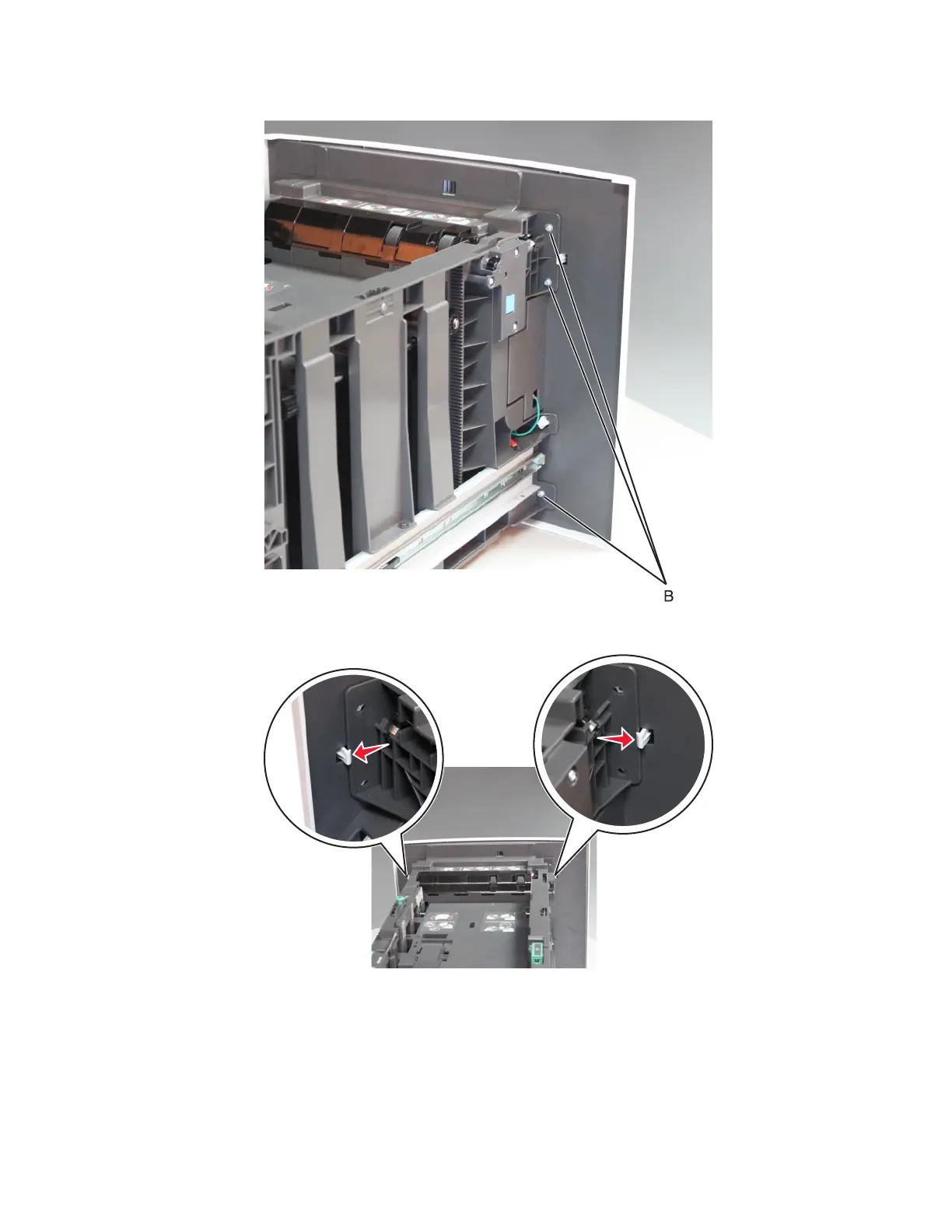 3 Remove the three screws (B) behind the cover at the other side.