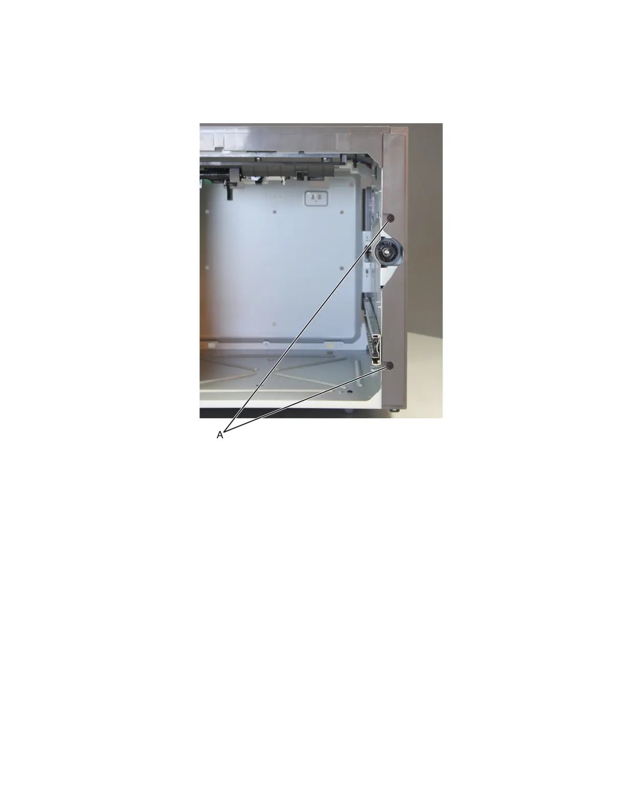 2 Remove the two screws (A) from the front side of the cover.