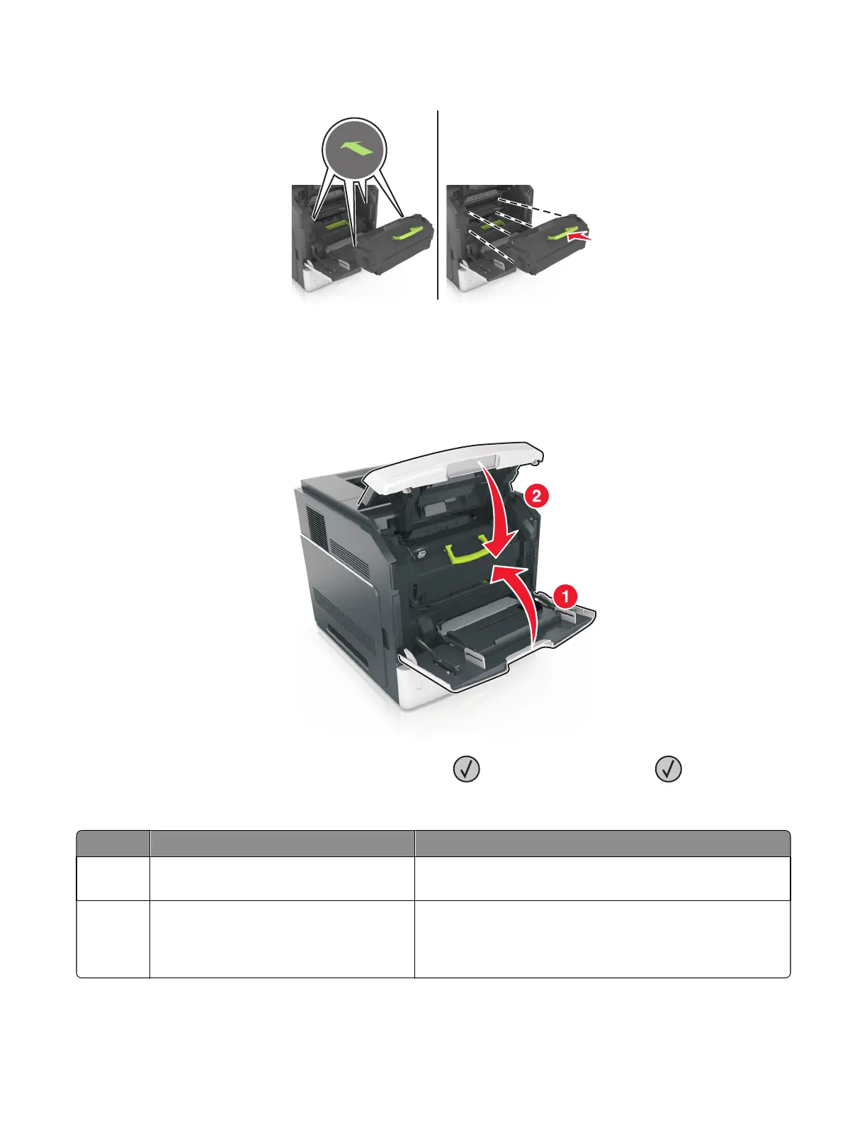 • Align the arrows on the guides of the toner cartridge with the arrows in the printer.