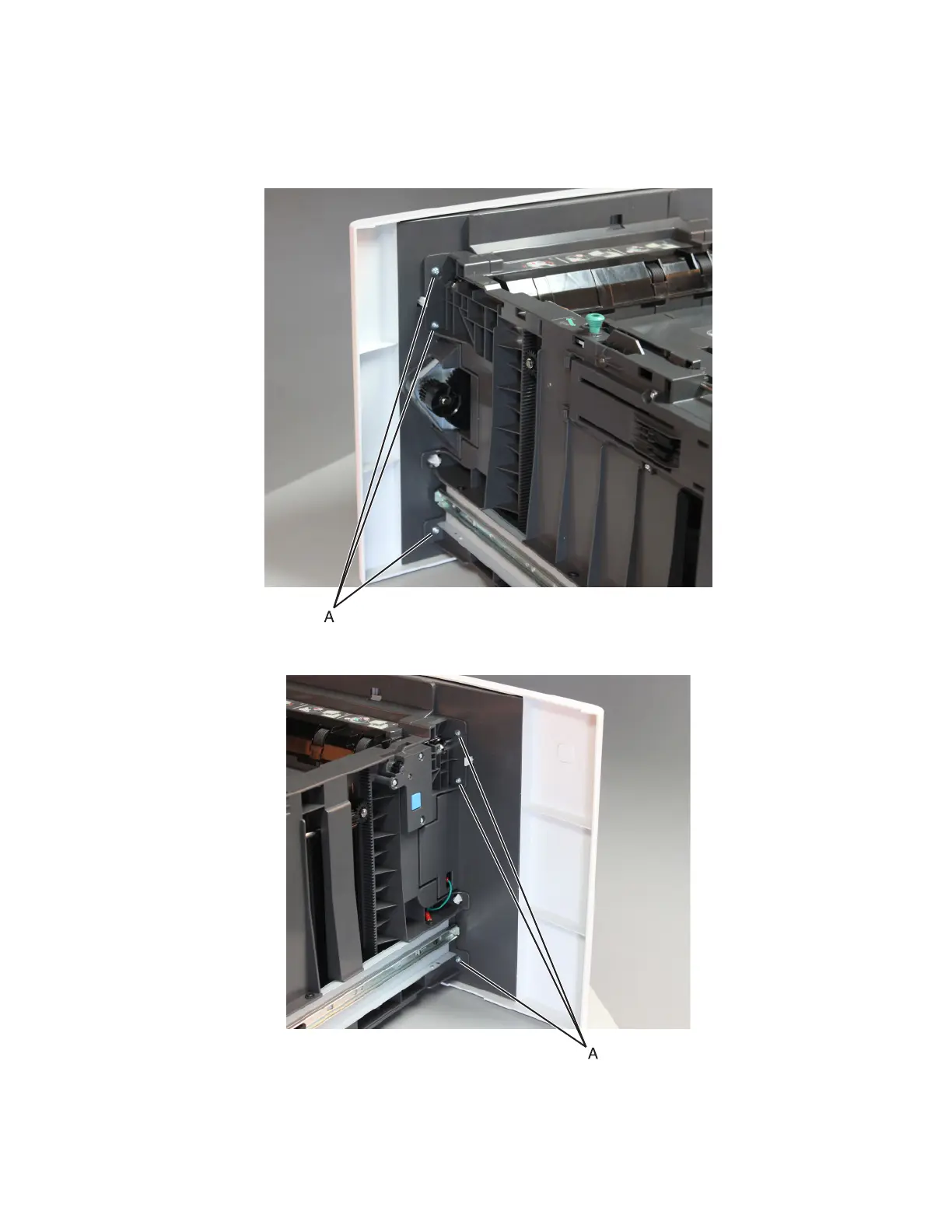2 Remove the three screws (A) behind the media tray front cover.
