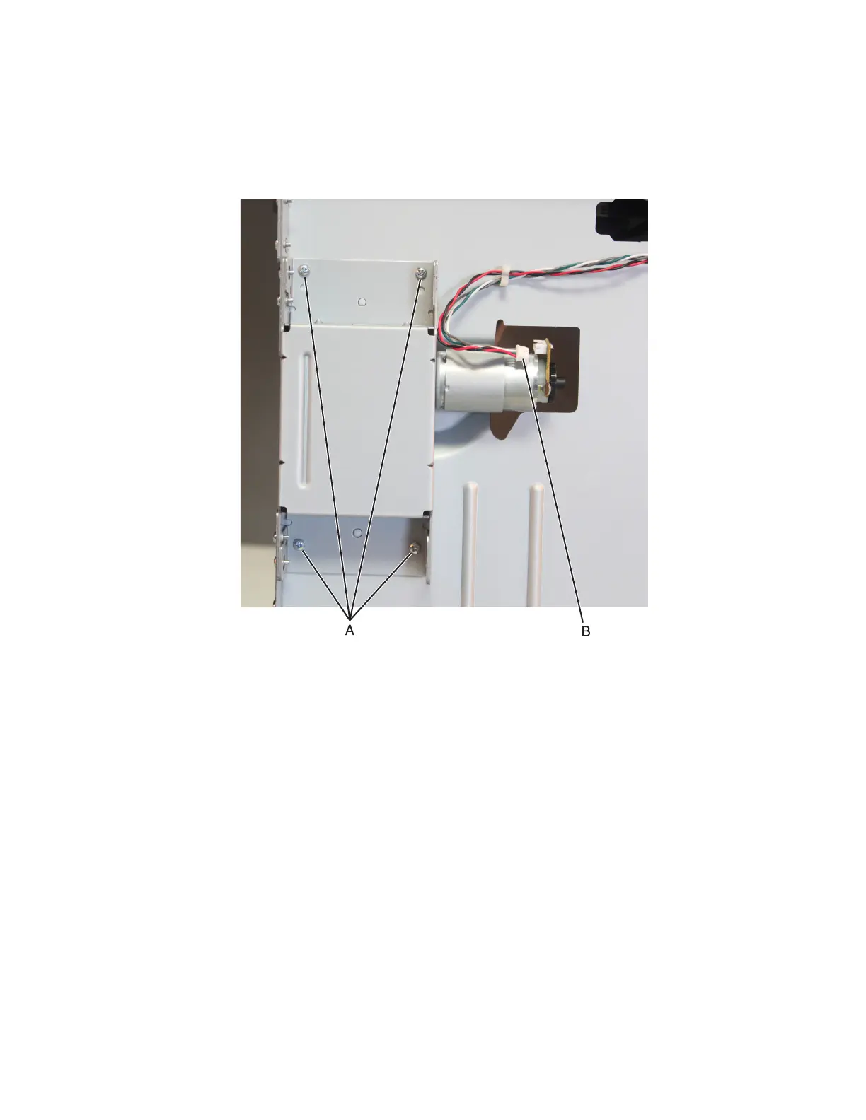 3 Disconnect the drive motor cable (B), then remove the four screws (A) from the drive motor frame.