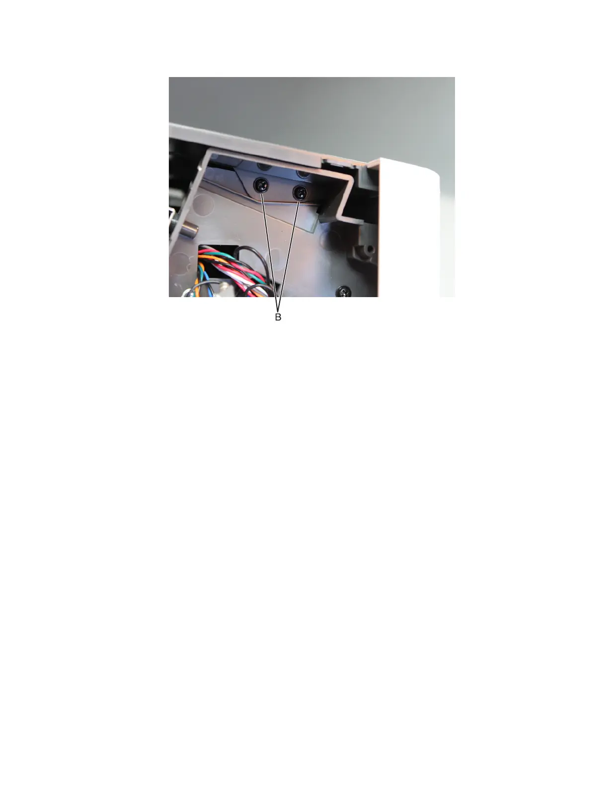 4 Remove the two screws (B) from the right side.