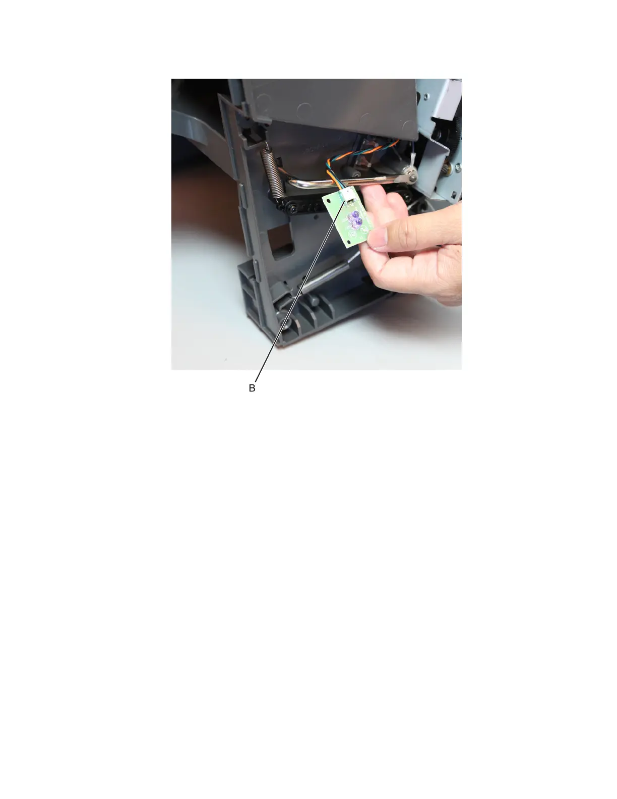 3 Disconnect the cable (B), and remove the sensor (bin full send).
