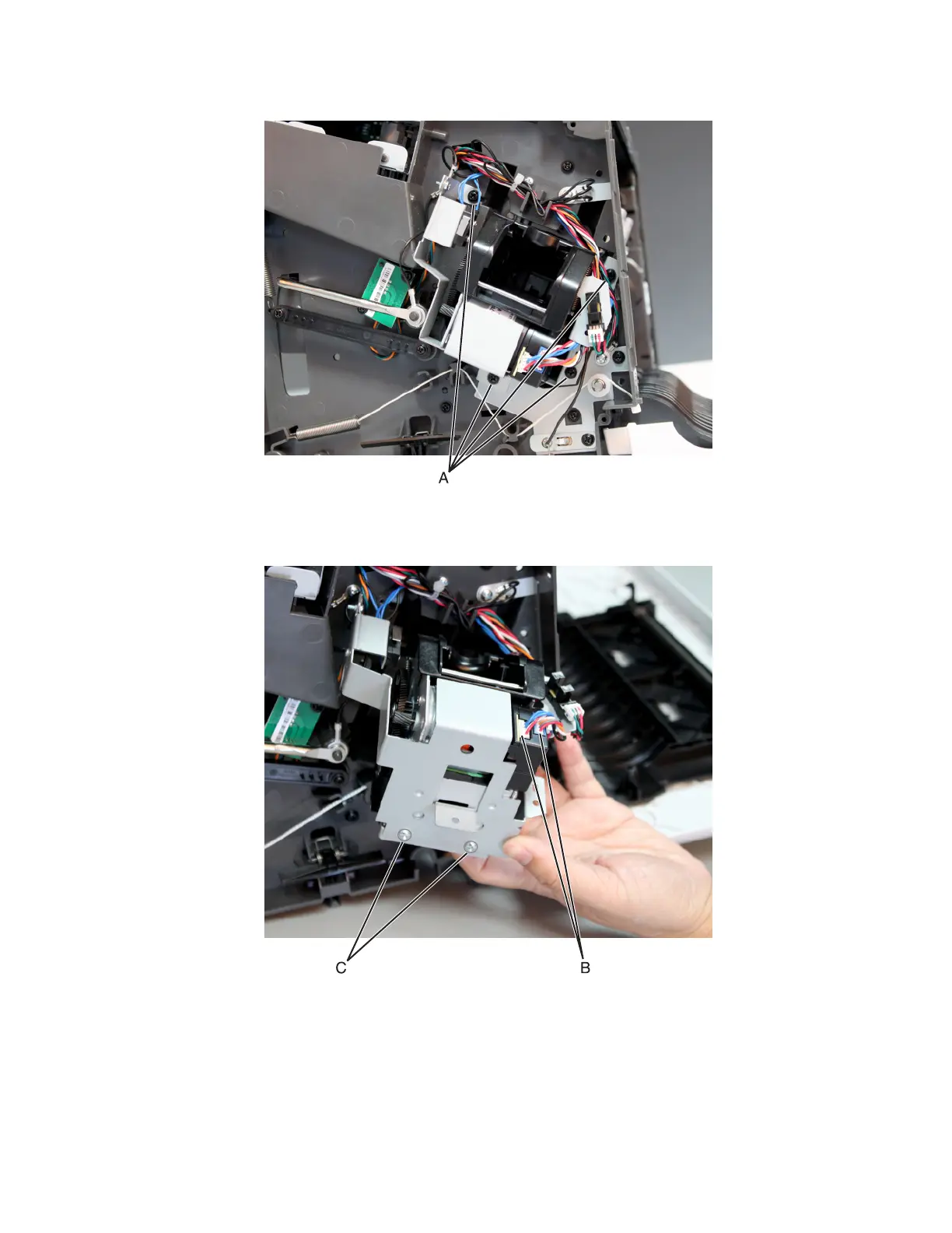 6 Lift the stapler carriage frame, then remove the two screws from the stapler carriage assembly (C).