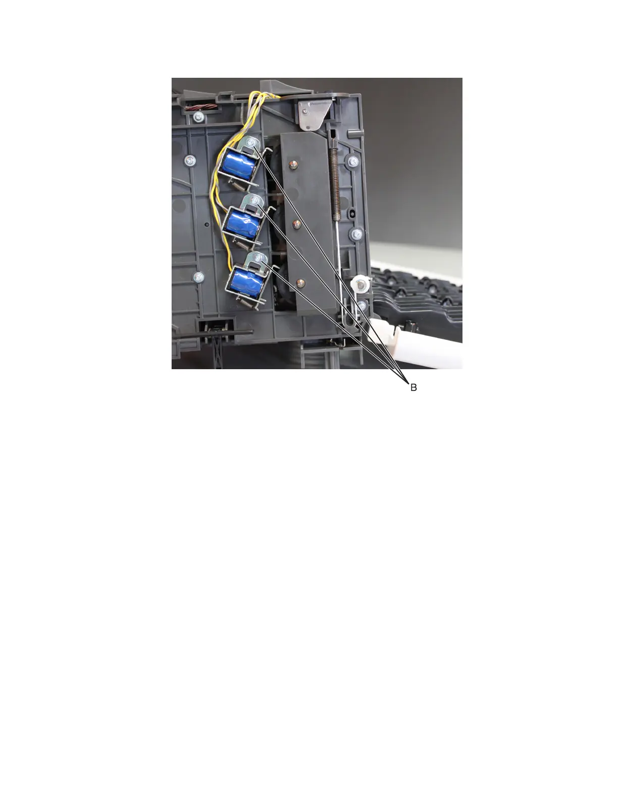 6 Remove the screw (B) securing the solenoid.