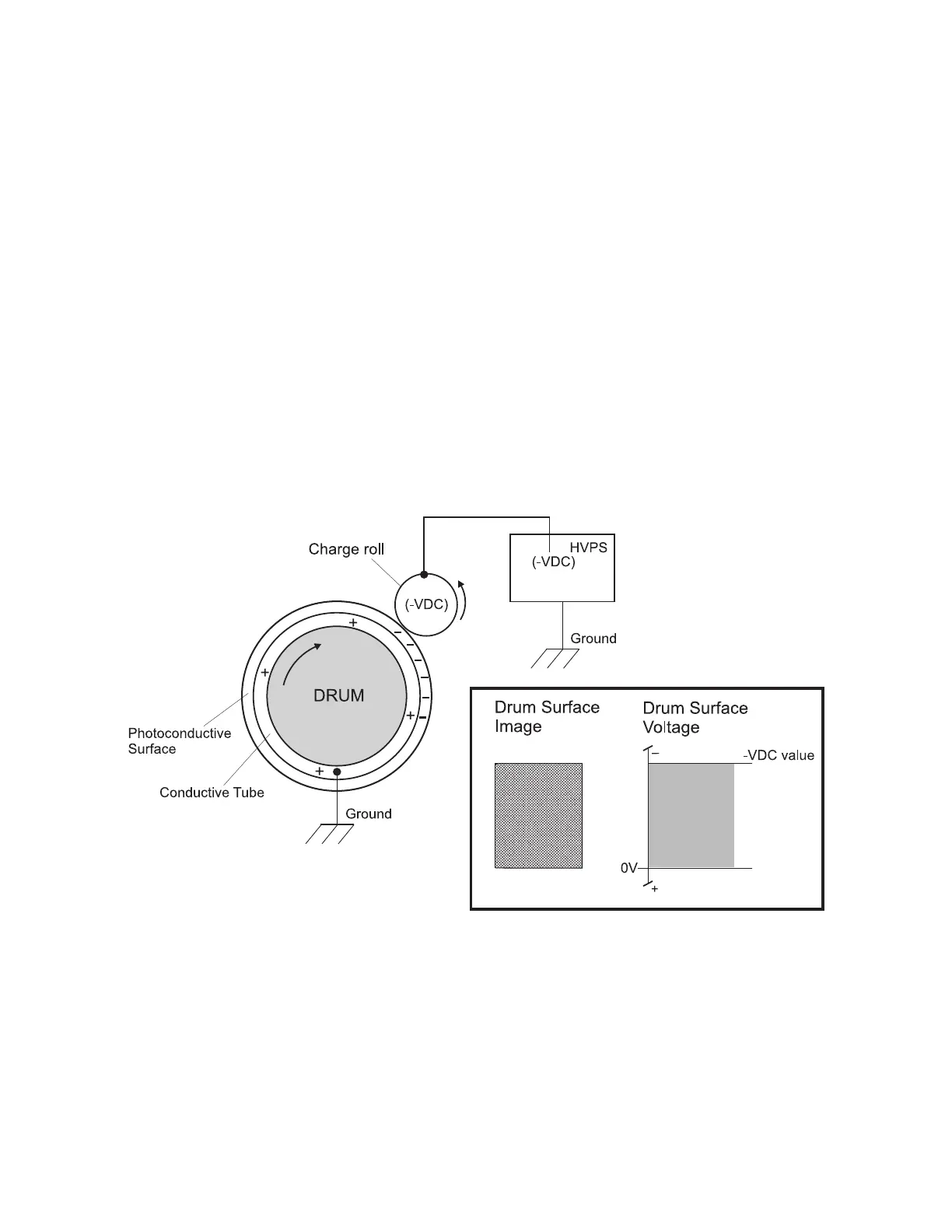 The charge roller places a uniform negative electrostatic charge on the surface of the drum. The drum surface is made