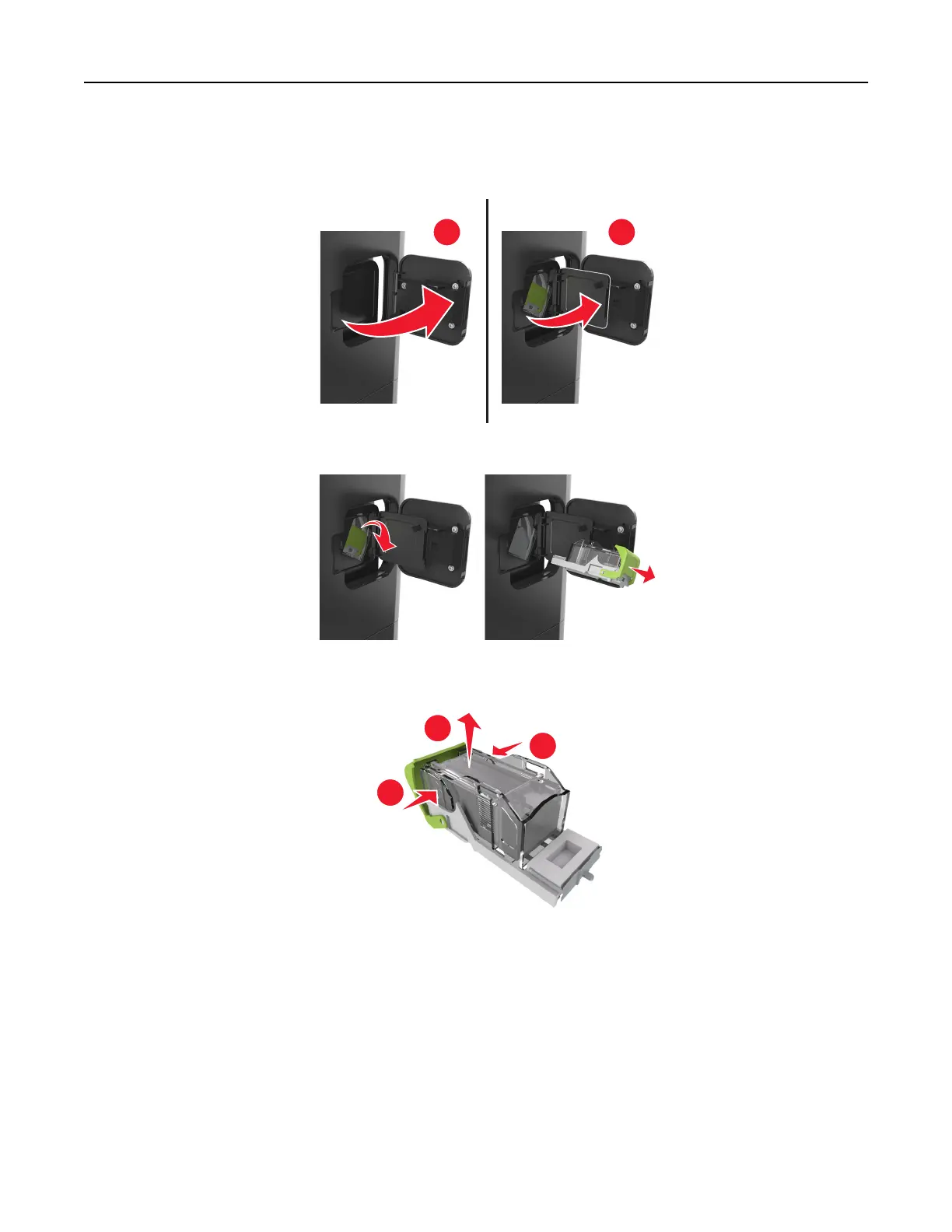 2 Pull down the latch of the staple cartridge holder, and then pull the holder out of the finisher.