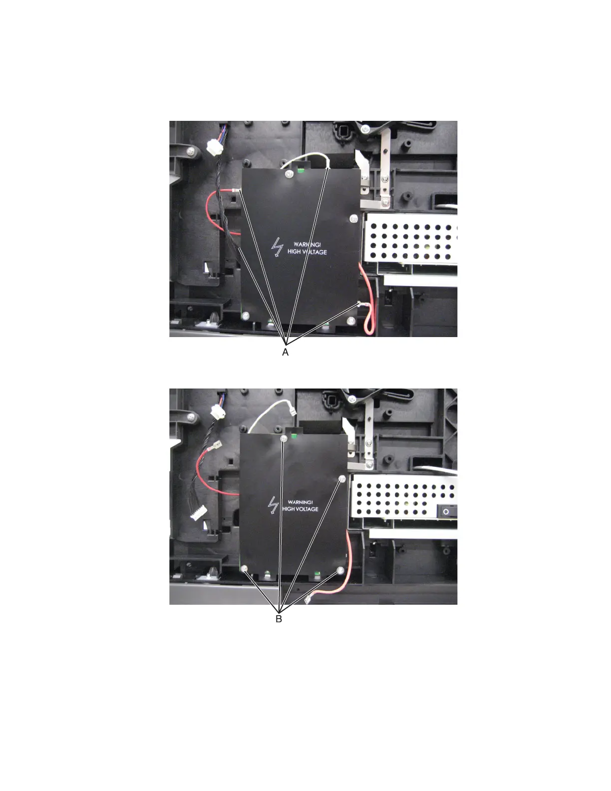 3 Remove the four screws (B) securing the HVPS to the machine.