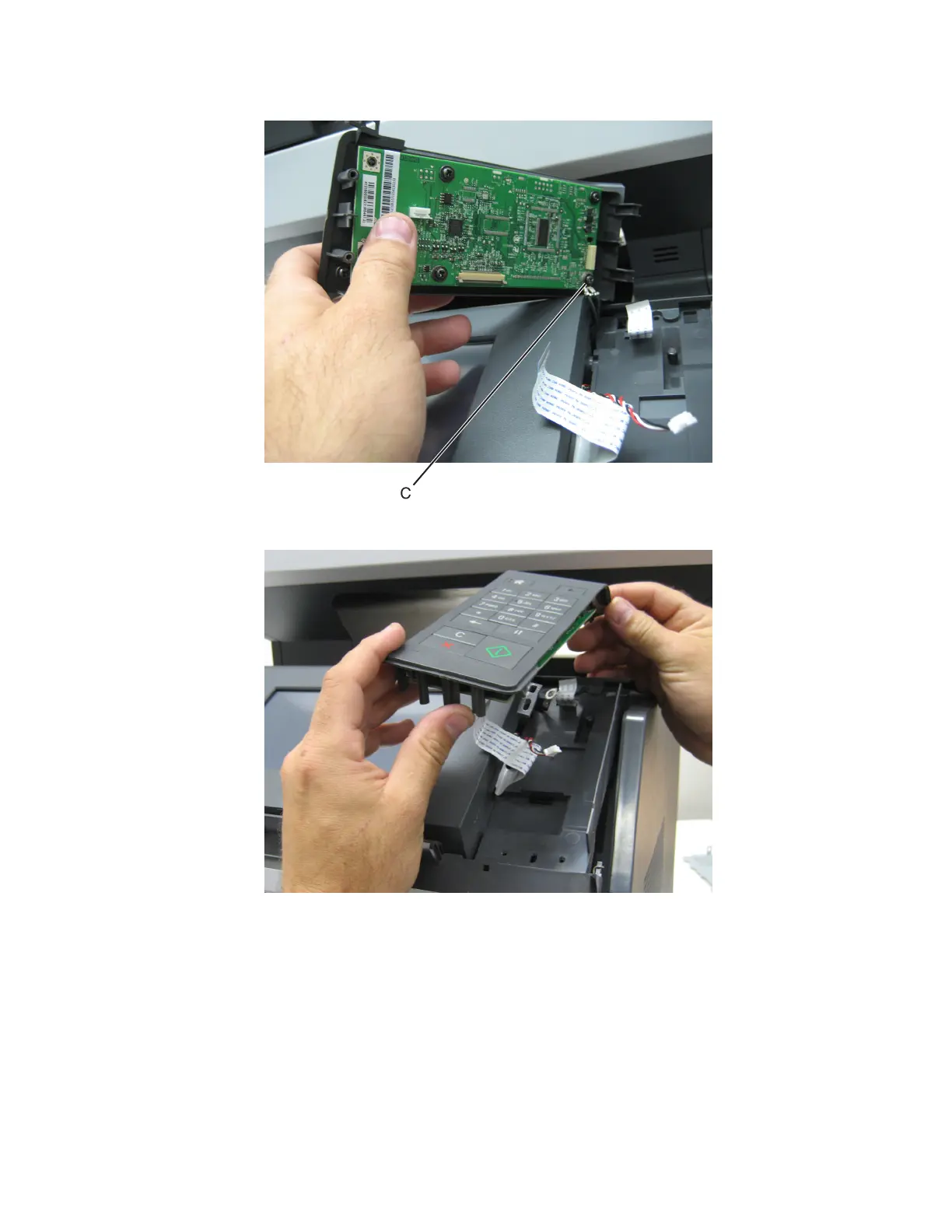 5 Remove the screw (C) securing the ground wires to the control panel right bezel.