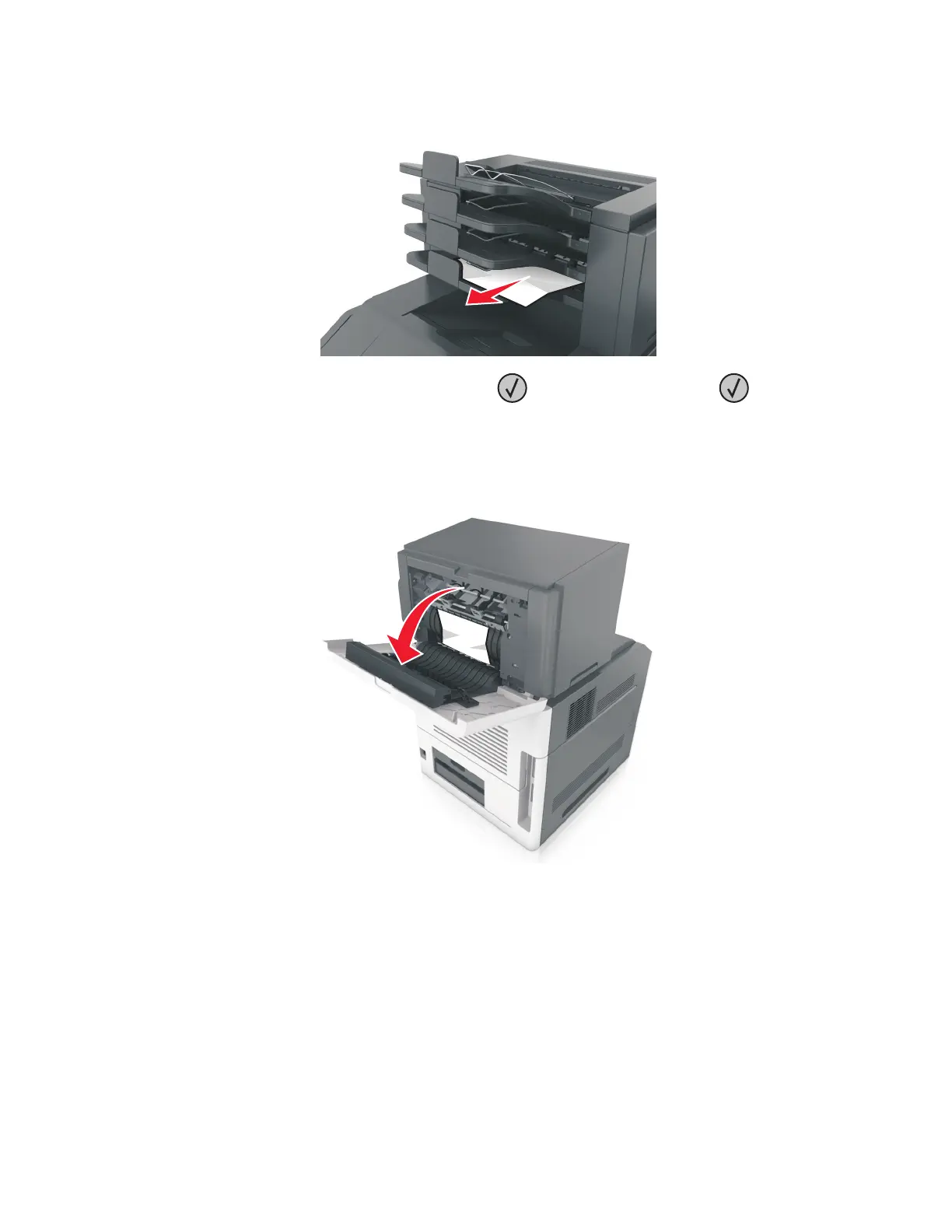 5 To clear the message and continue printing, select Next > > Clear the jam, press OK > .