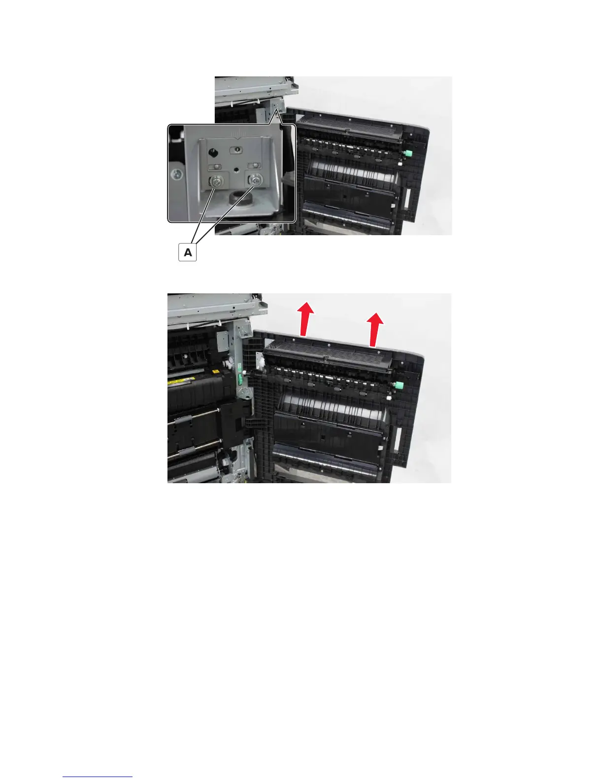 2 Remove the two screws (A), and then remove the upper hinge.