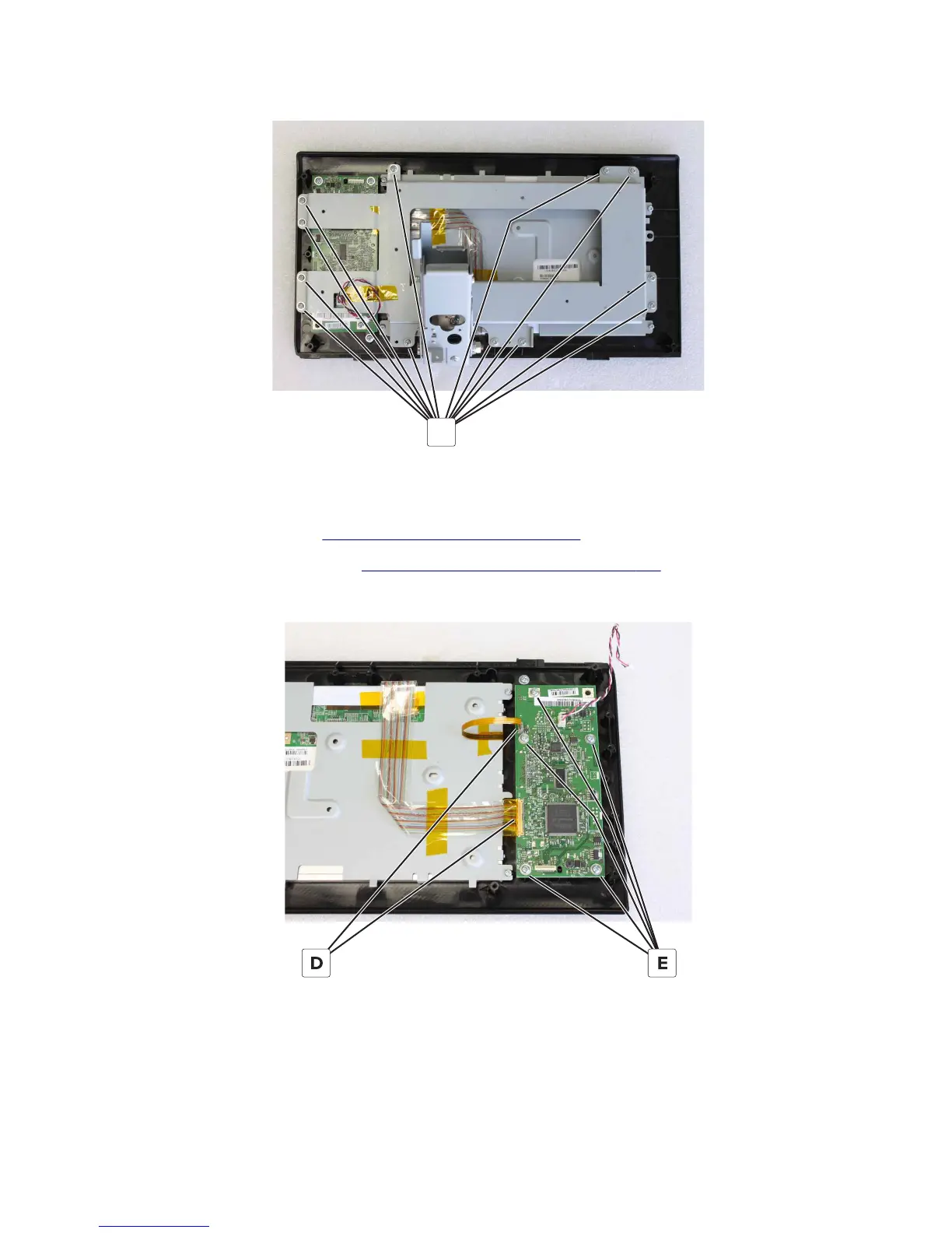 3 Disconnect the two cables (D), and then remove the five screws (E).