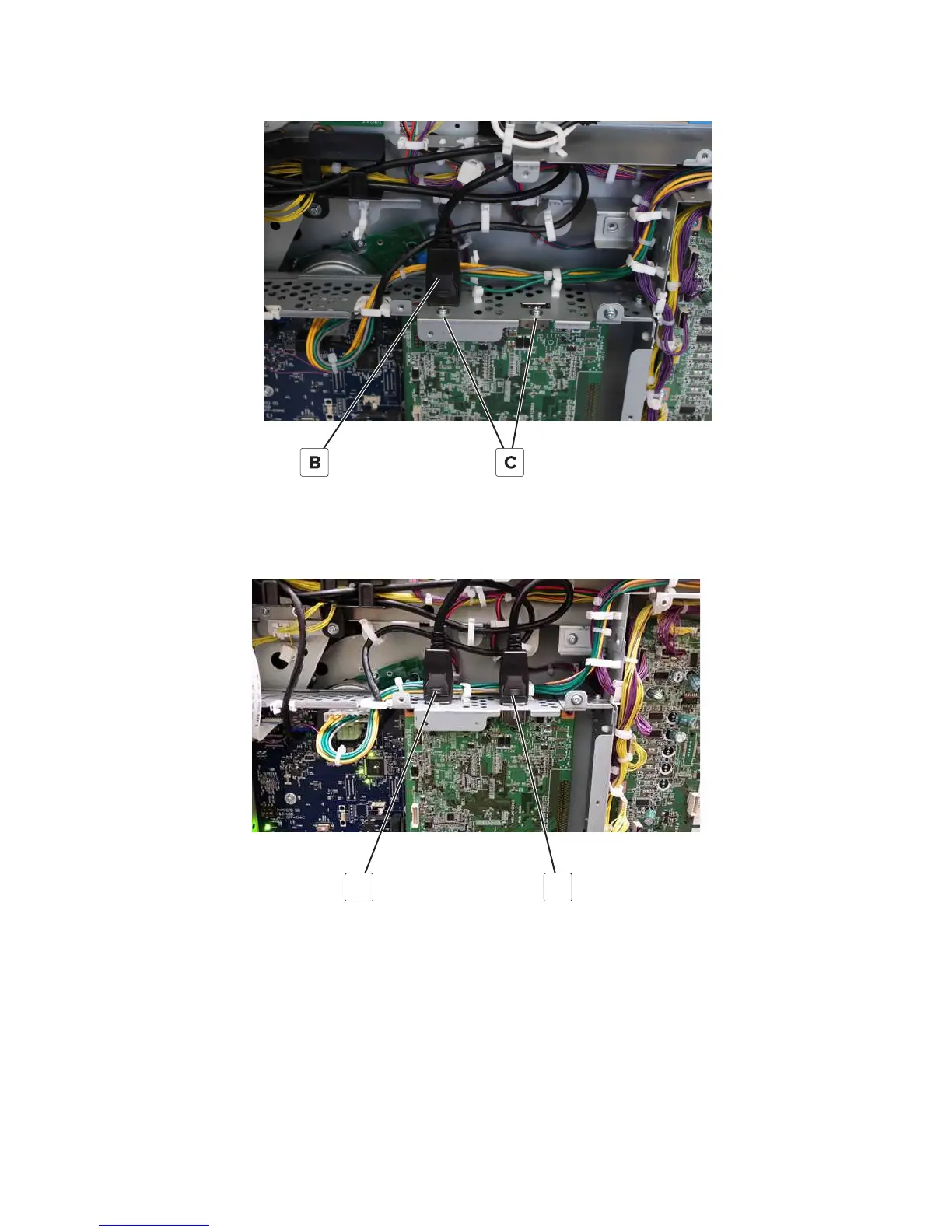 Installation note: Connect the scanner CCD cable (A) and ADF CIS data cable (B) as shown in the illustration. If the