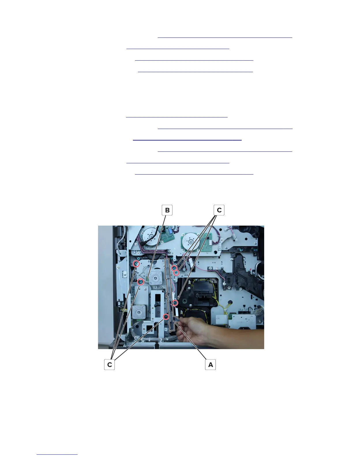 8 Disconnect the cable (B), and then remove the six screws (C).