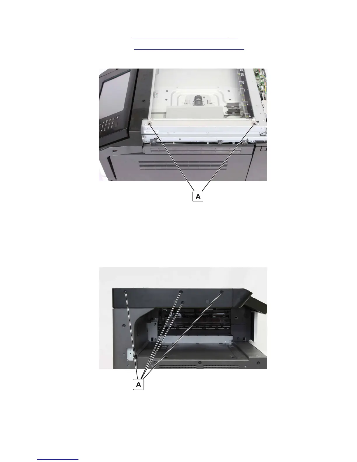 5 Remove the two screws (A), and then remove the scanner glass retainers.