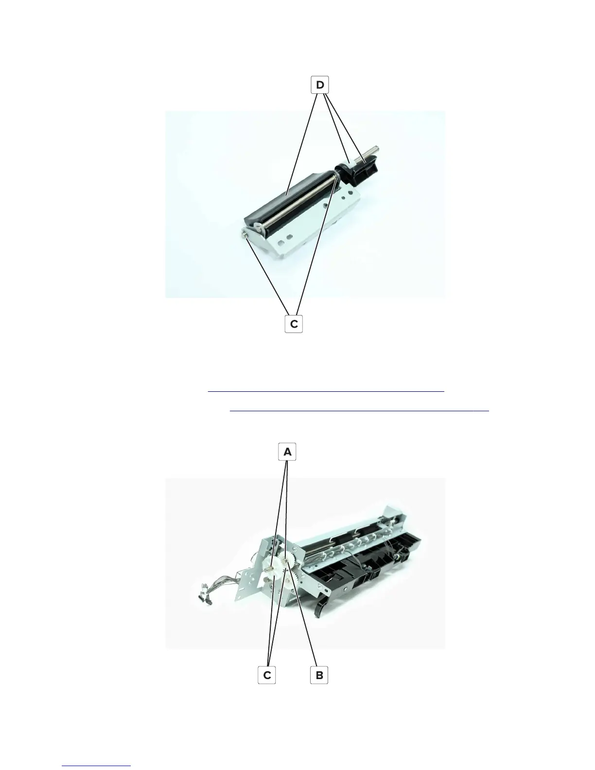 5 Remove the vertical media transport guide assembly (D) from the shafts.